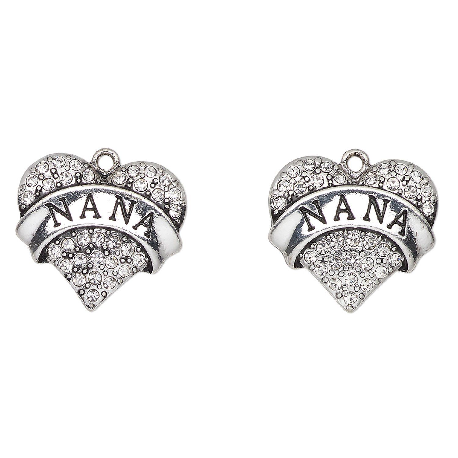 Charm, antique silver-finished enamel "pewter" (zinc-based alloy) and glass, clear and black, 24x23mm heart with "Nana". Sold per pkg of 2.