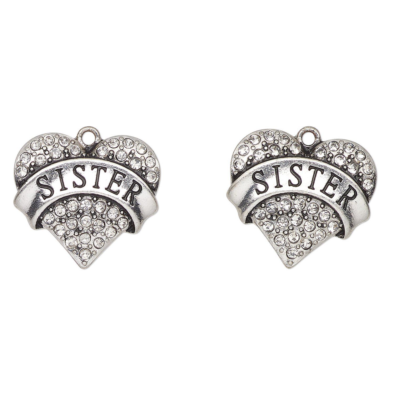 Charm, antique silver-finished enamel "pewter" (zinc-based alloy) and glass, clear and black, 24x23mm heart with "Sister". Sold per pkg of 2.