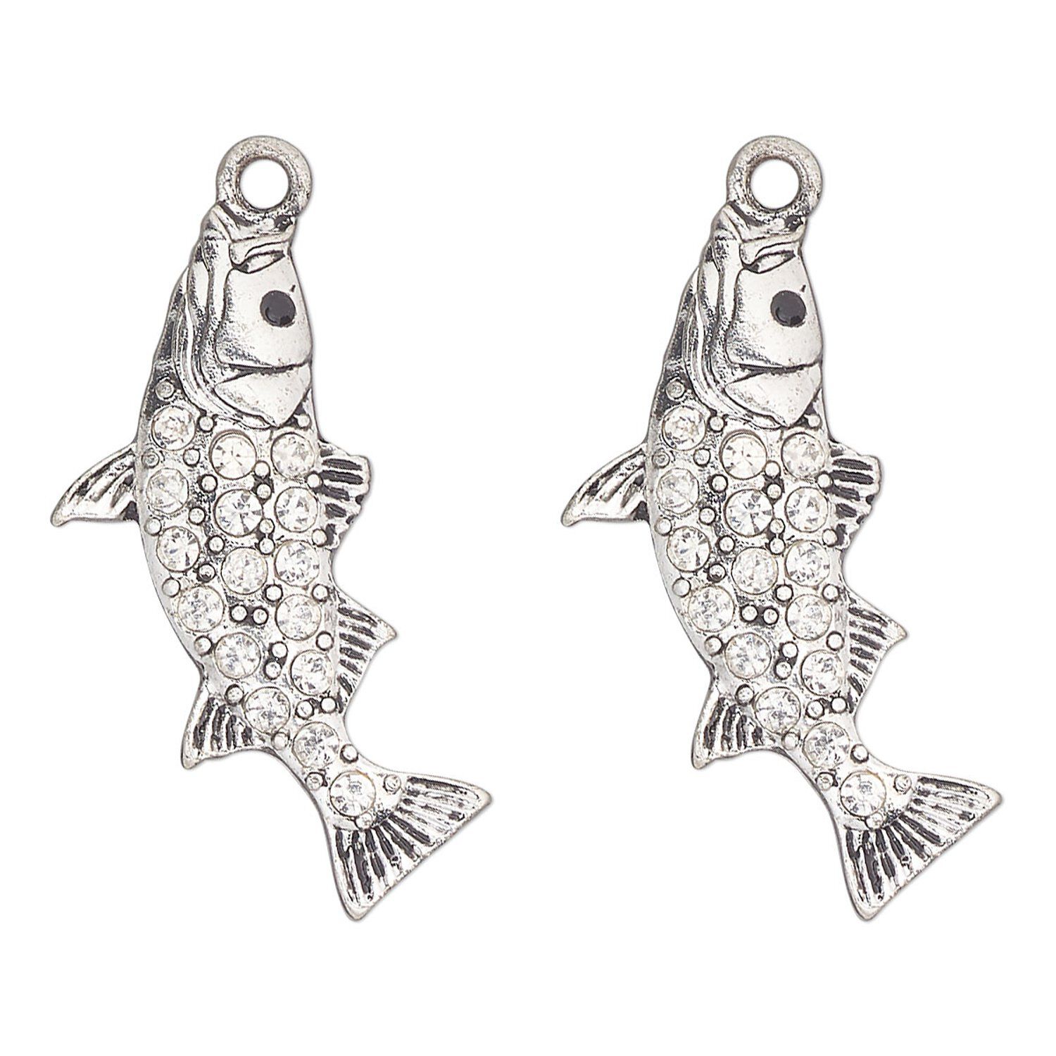 Focal, antique silver-finished "pewter" (zinc-based alloy) and glass, clear and black, 30x19mm single-sided fish. Sold per pkg of 2.