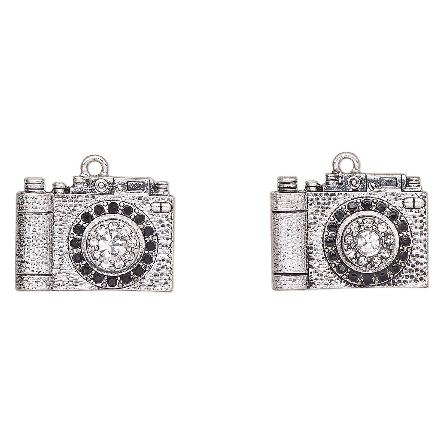 Charm, antique silver-finished "pewter" (zinc-based alloy) and glass, clear and black, 24x18mm camera. Sold per pkg of 2.
