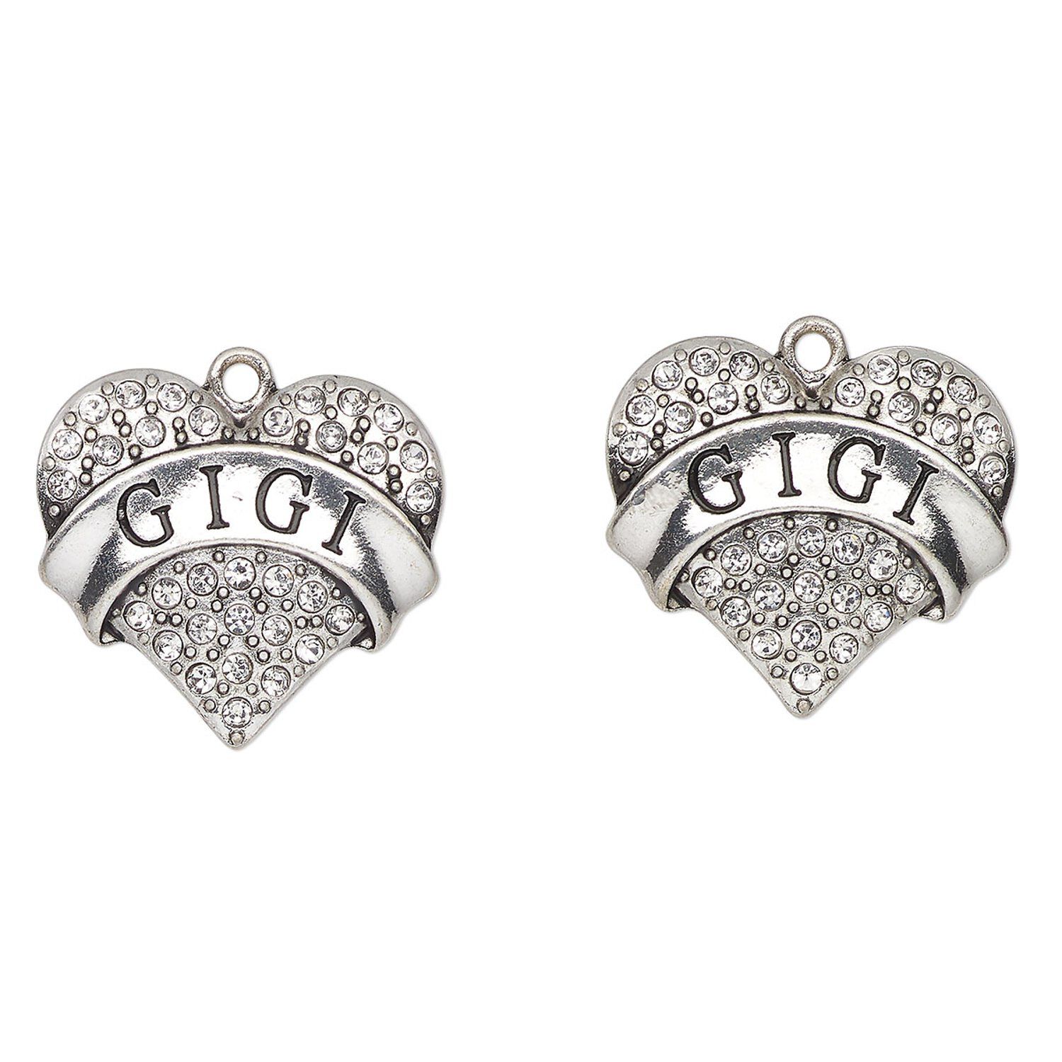 Charm, antique silver-finished enamel "pewter" (zinc-based alloy) and glass, clear and black, 24x23mm heart with "Gigi". Sold per pkg of 2.