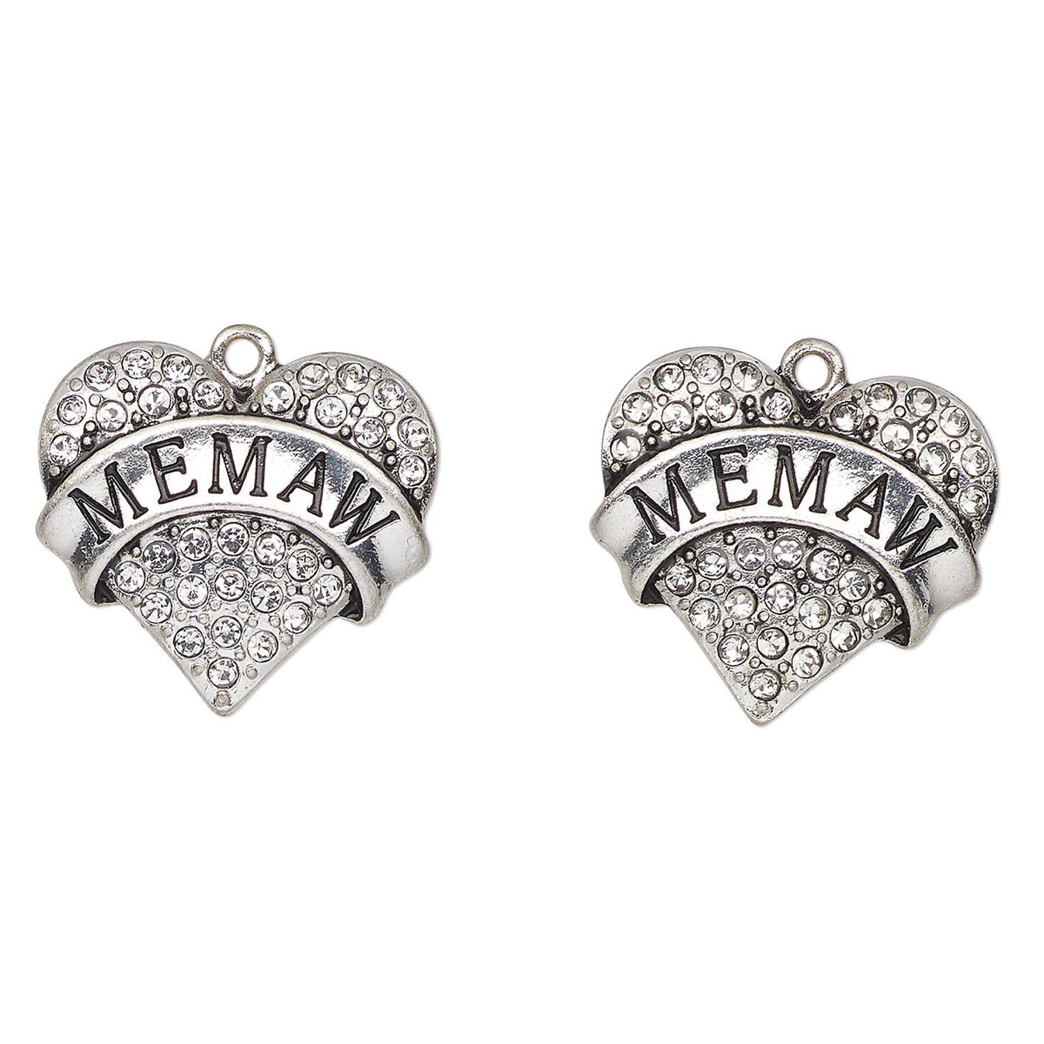 Charm, antique silver-finished enamel "pewter" (zinc-based alloy) and glass, clear and black, 24x23mm heart with "Memaw". Sold per pkg of 2.
