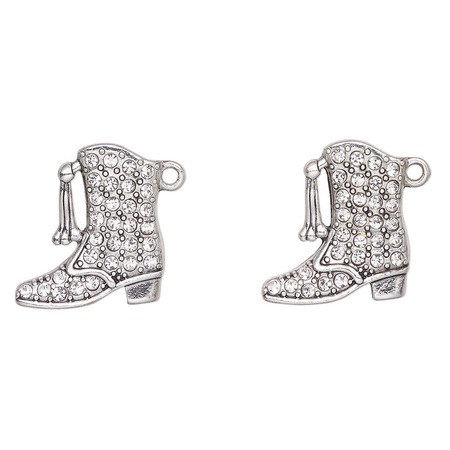 Charm, antique silver-finished "pewter" (zinc-based alloy) and glass, clear, 26x23mm cowboy boot. Sold per pkg of 2.