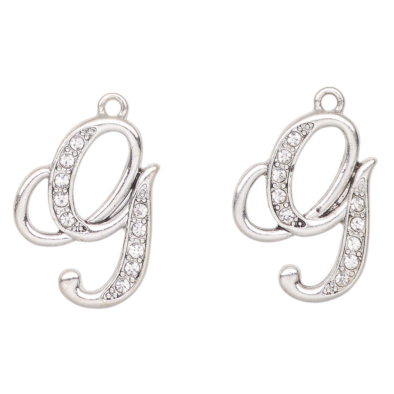 Charm, antique silver-finished "pewter" (zinc-based alloy) and glass, clear, 25x18mm letter "G". Sold per pkg of 2.