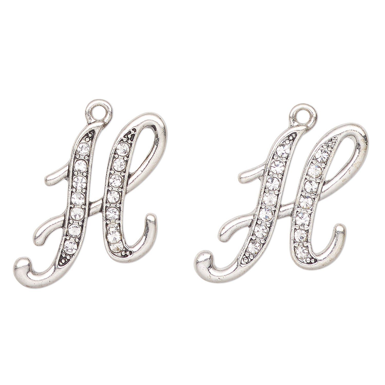 Charm, antique silver-finished "pewter" (zinc-based alloy) and glass, clear, 25x20mm letter "H". Sold per pkg of 2.
