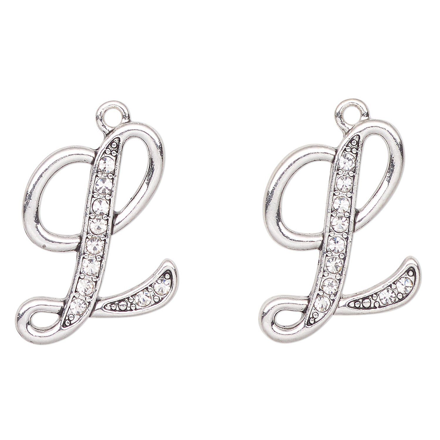 Charm, antique silver-finished "pewter" (zinc-based alloy) and glass, clear, 25x19mm letter "L". Sold per pkg of 2.
