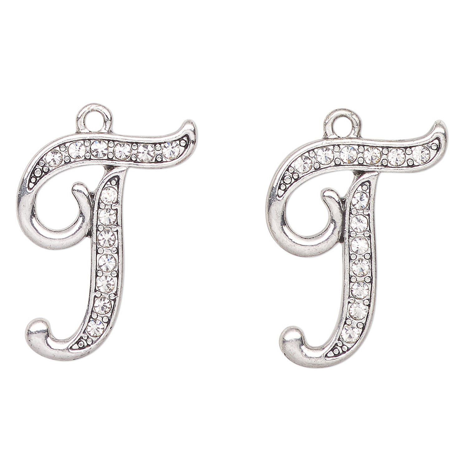Charm, antique silver-finished "pewter" (zinc-based alloy) and glass, clear, 25x21mm letter "T". Sold per pkg of 2.