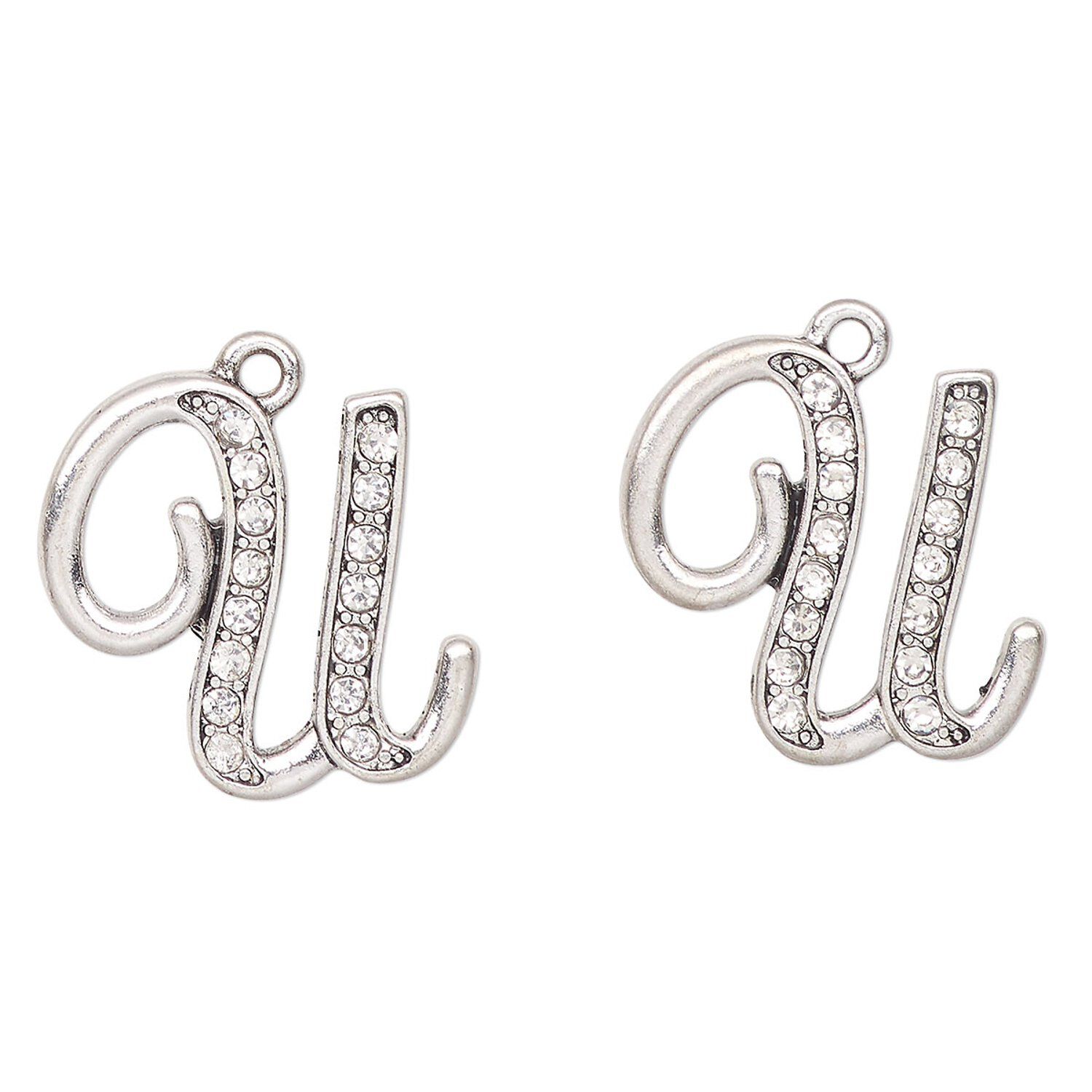 Charm, antique silver-finished "pewter" (zinc-based alloy) and glass, clear, 22x21mm letter "U". Sold per pkg of 2.