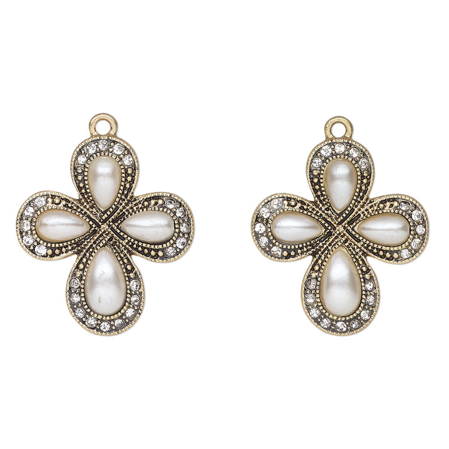 Drop, antique gold-finished "pewter" (zinc-based alloy), acrylic pearl and glass, clear and white, 29x26mm cross. Sold per pkg of 2.