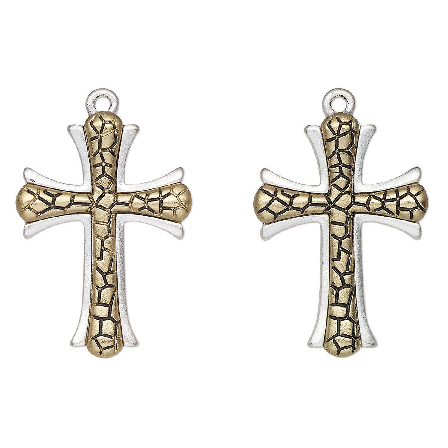 Focal, antique gold-finished and antique silver-finished "pewter" (zinc-based alloy), 34x24mm textured cross. Sold per pkg of 2.