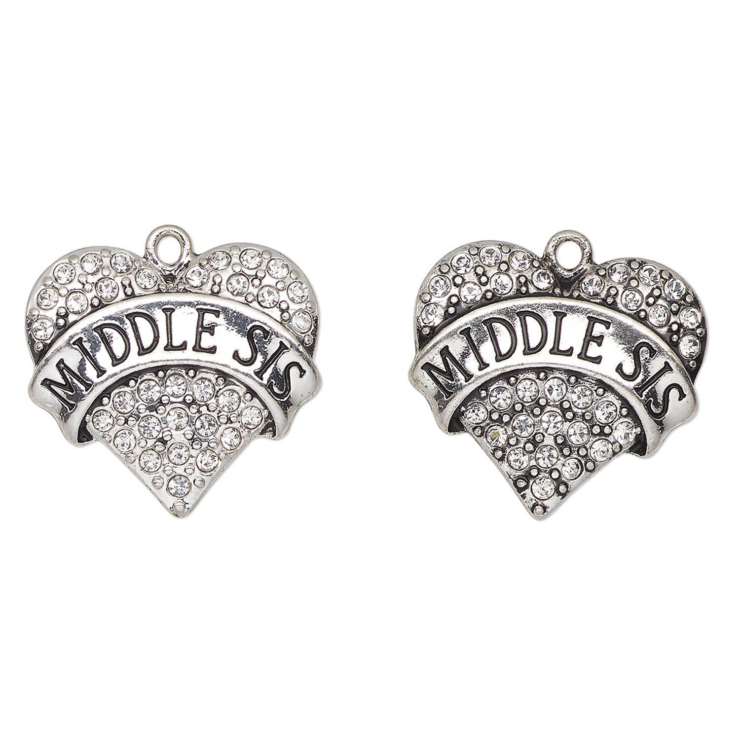 Charm, antique silver-finished enamel "pewter" (zinc-based alloy) and glass, clear and black, 24x23mm heart with "Middle Sis". Sold per pkg of 2.