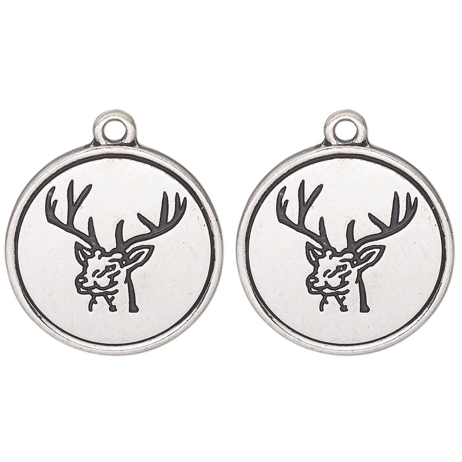 Drop, antique silver-finished "pewter" (zinc alloy) and enamel, black, 21mm single-sided round with elk head design. Sold per pkg of 2.