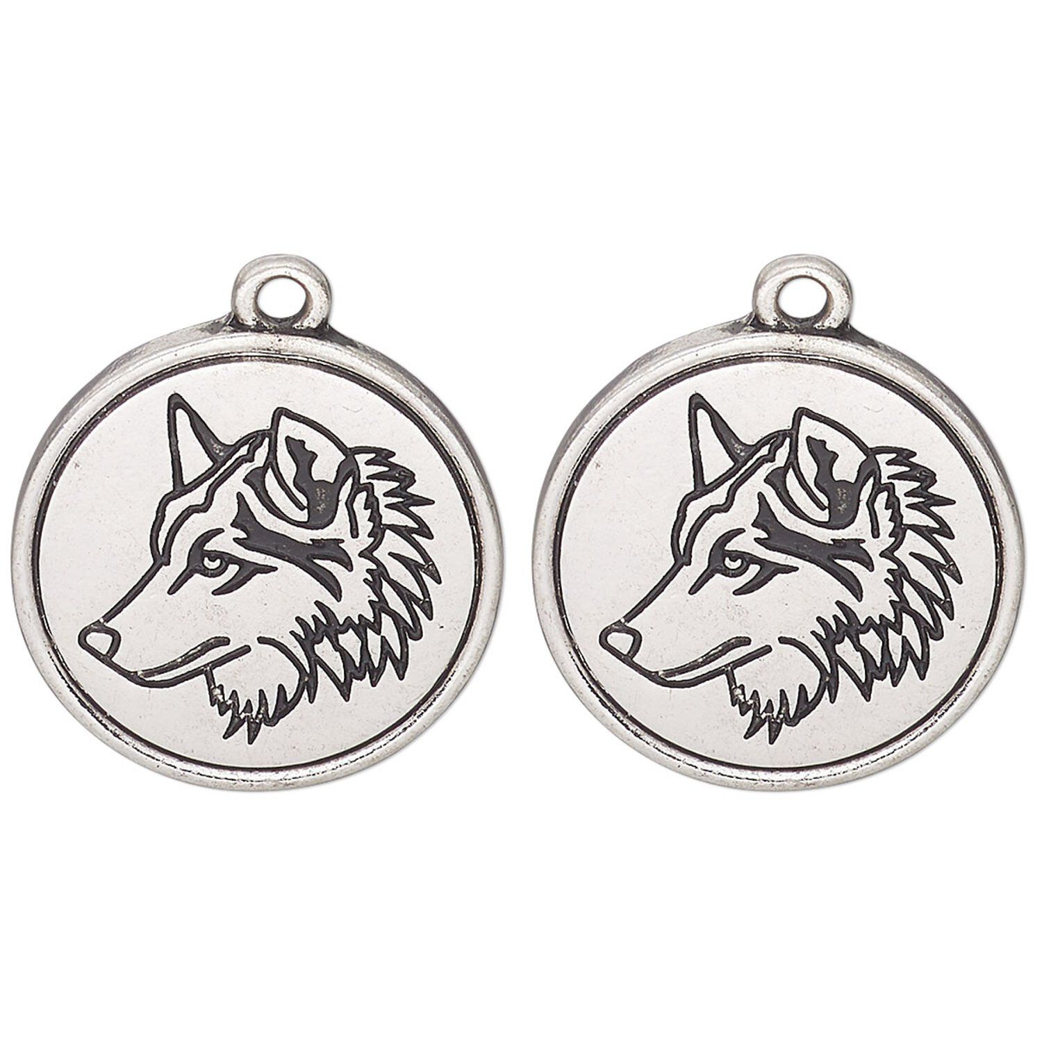 Drop, antique silver-finished "pewter" (zinc alloy) and enamel, black, 21mm round with wolf head design. Sold per pkg of 2.