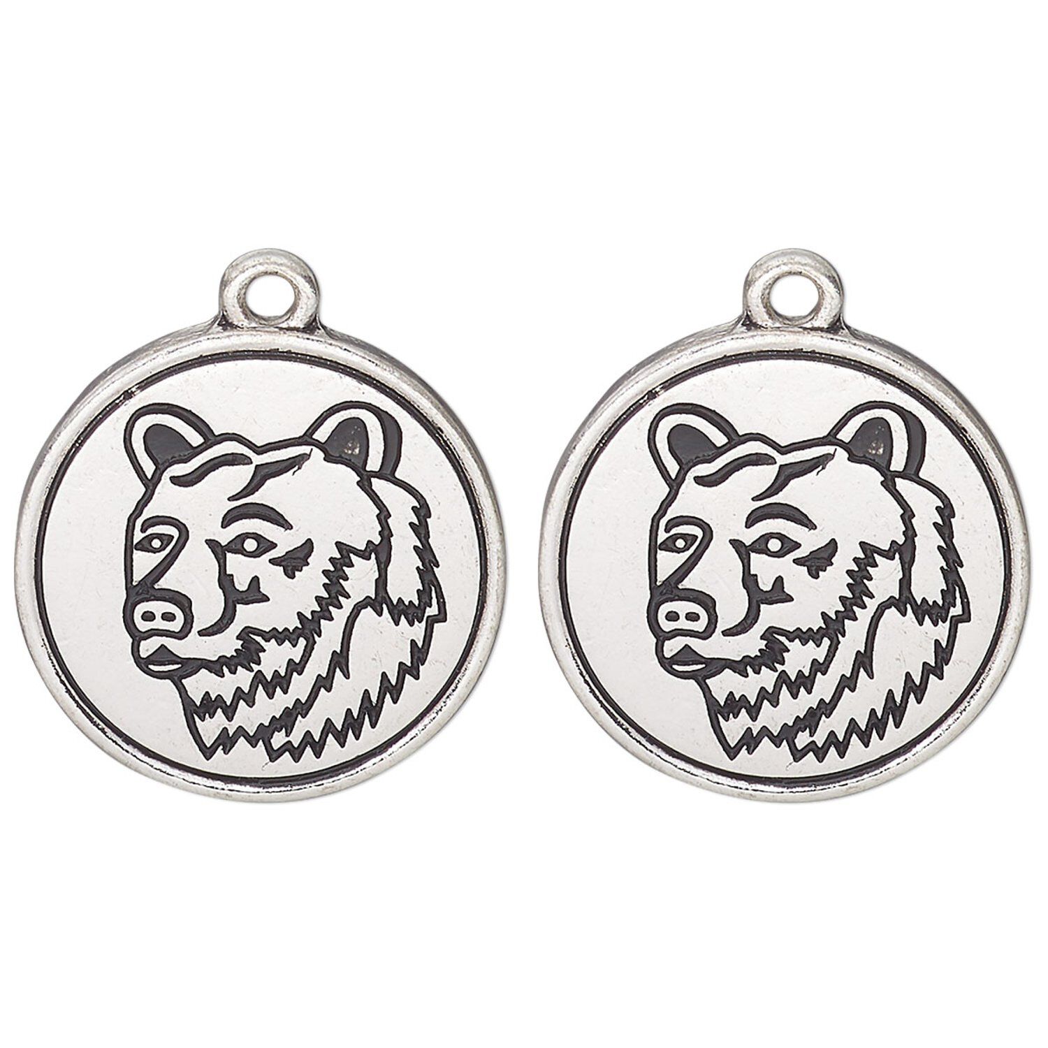 Drop, antique silver-finished "pewter" (zinc alloy) and enamel, black, 21mm round with bear head design. Sold per pkg of 2.