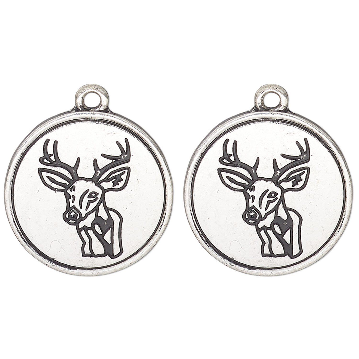 Drop, antique silver-finished "pewter" (zinc alloy) and enamel, black, 21mm single-sided round with deer head design. Sold per pkg of 2.
