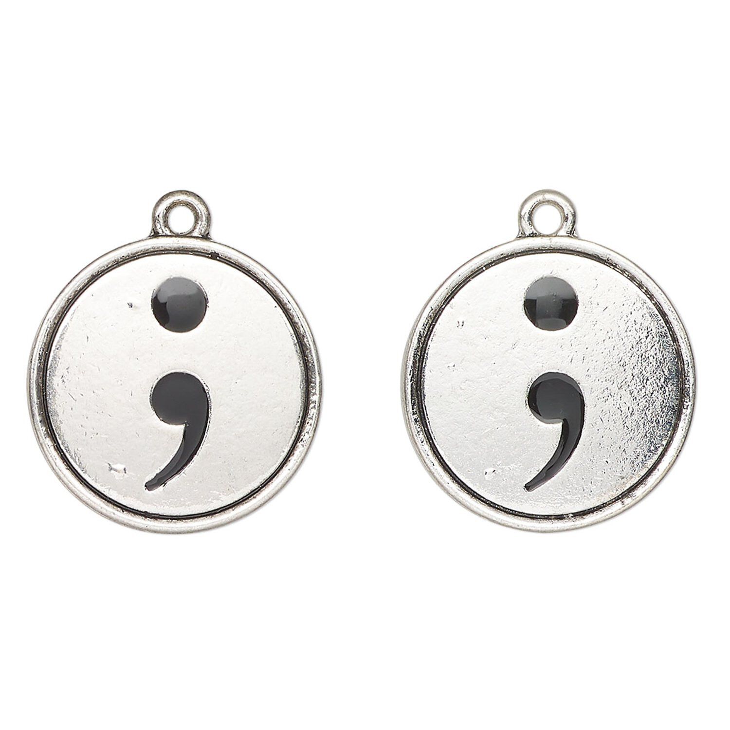Charm, antique silver-finished enamel "pewter" (zinc-based alloy), black, 21mm round with semi-colon. Sold per pkg of 2.