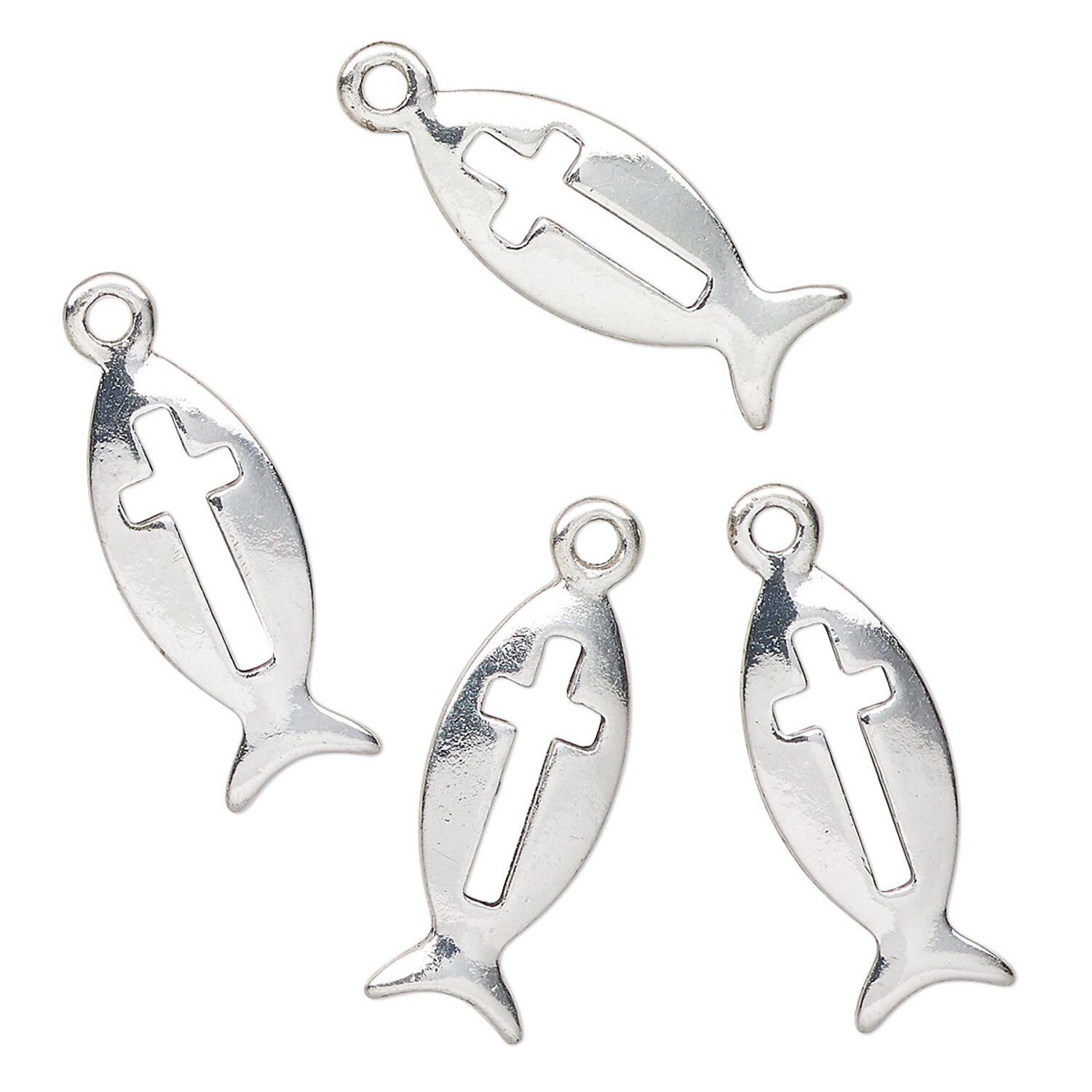 Drop, antique silver-finished "pewter" (zinc-based alloy), 22x19mm Christian fish with cutout cross. Sold per pkg of 4.