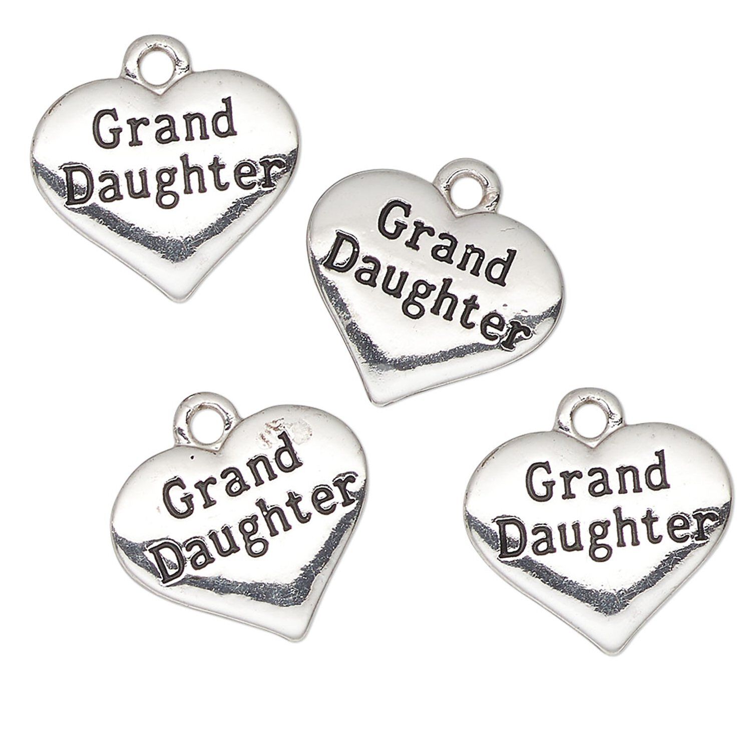 Charm, antique silver-finished "pewter" (zinc-based alloy) and enamel, black, 16x13mm heart with "Granddaughter". Sold per pkg of 4.