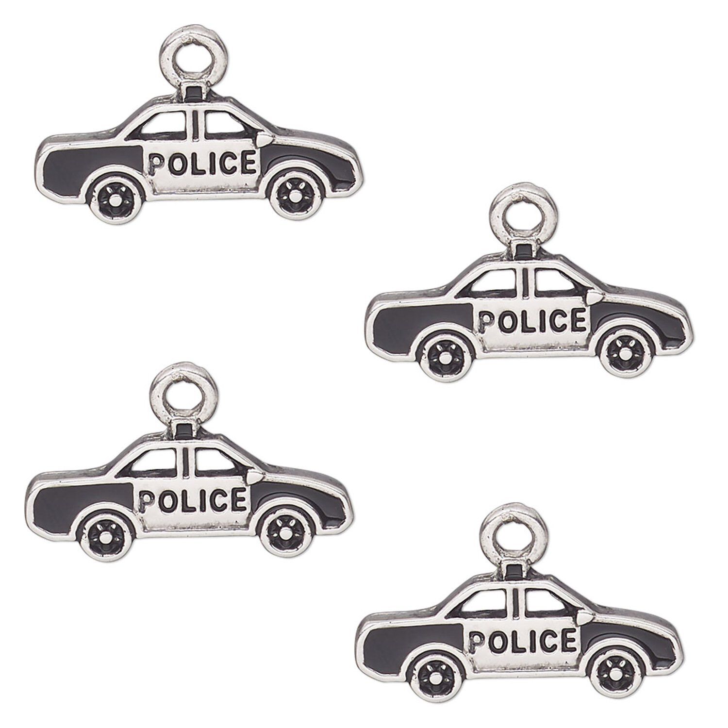 Antique silver-finished police car charms feature crisp casting and clever details. These single-sided charms are ideal to use in themed jewelry designs for customers in the law enforcement field and make eye-catching additions to resale lines.