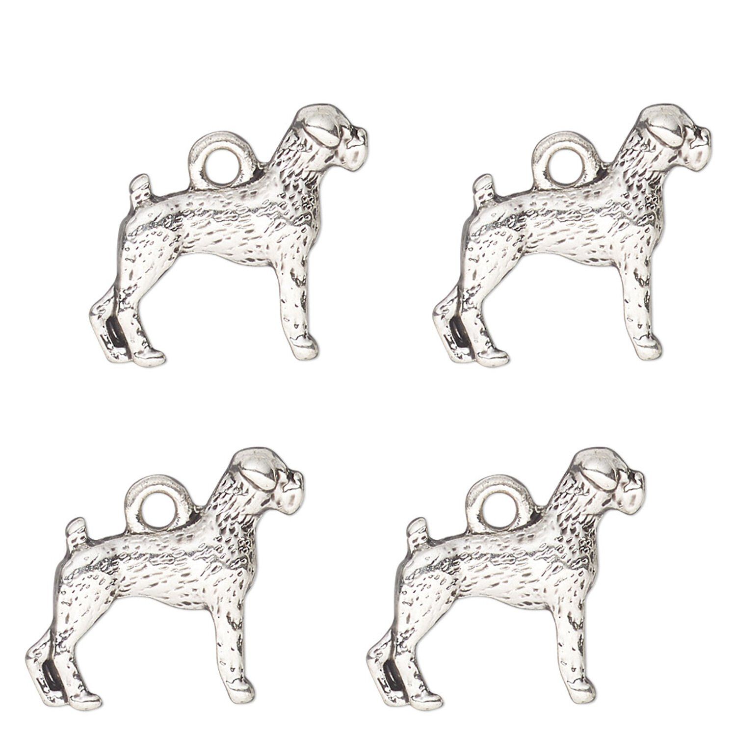 Zinc-based "pewter" dog charms personalize jewelry designs with instant style. Quality-made components are economical and great for quick resale. Add a jump ring to easily attach to charm bracelets, necklace chains, ear wires and more.