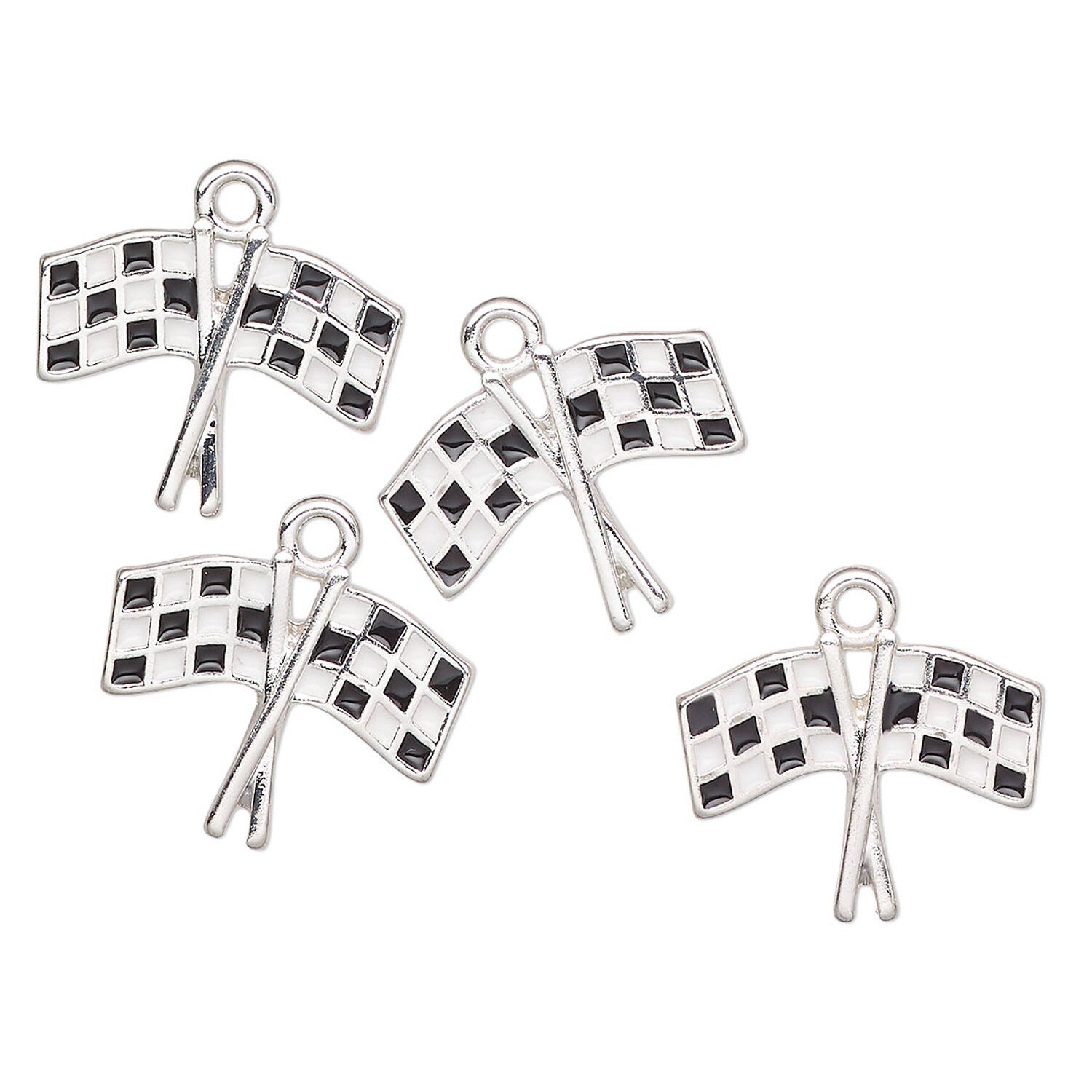 Charm, antique silver-finished enamel "pewter" (zinc-based alloy), black and white, 18x15mm checker flag. Sold per pkg of 4.