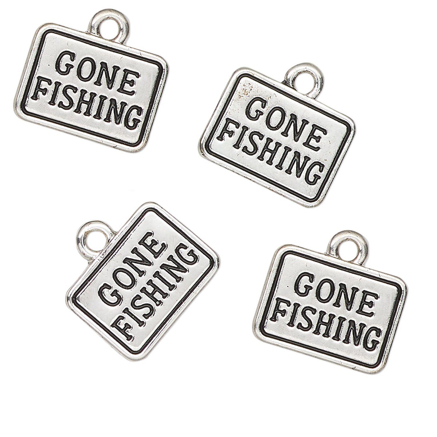 Charm, antique silver-finished "pewter" (zinc-based alloy), 14x10mm rectangle with gone fishing. Sold per pkg of 4.
