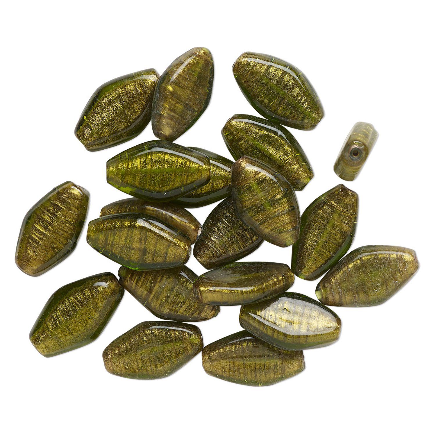 Bead, lampworked glass, translucent moss green, 31x18mm-33x19mm flat marquise with copper-colored glitter. Sold per pkg of 20.