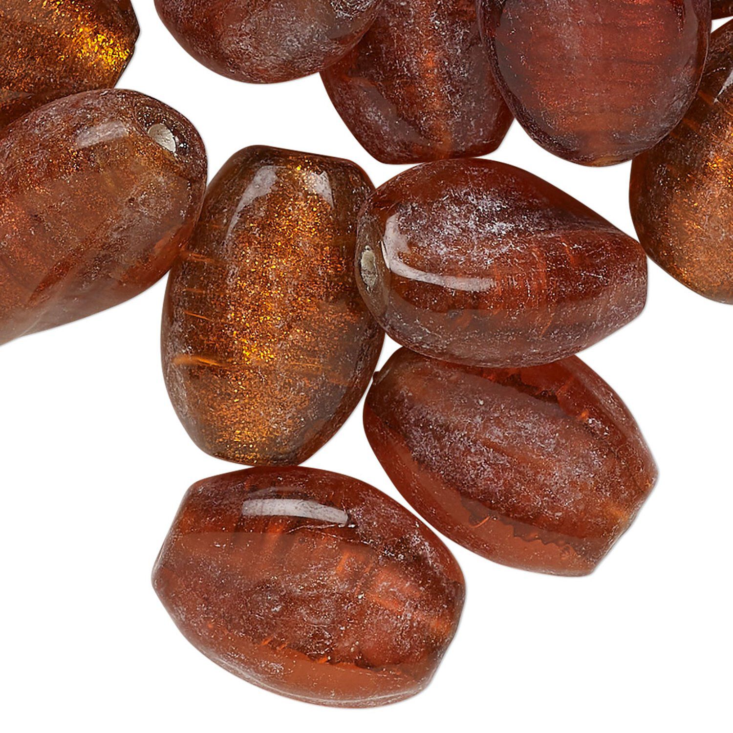 Bead, lampworked glass, translucent red-orange, 18x13mm-19x15mm twisted flat oval with copper-colored glitter. Sold per pkg of 25.
