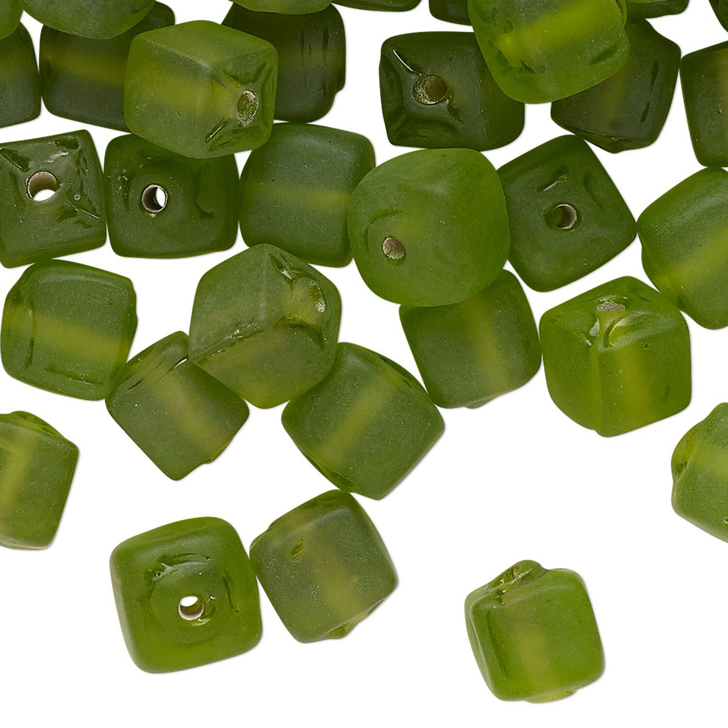 Bead, lampworked glass, translucent green, 8mm cube. Sold per 4-ounce pkg, approximately 130 beads.