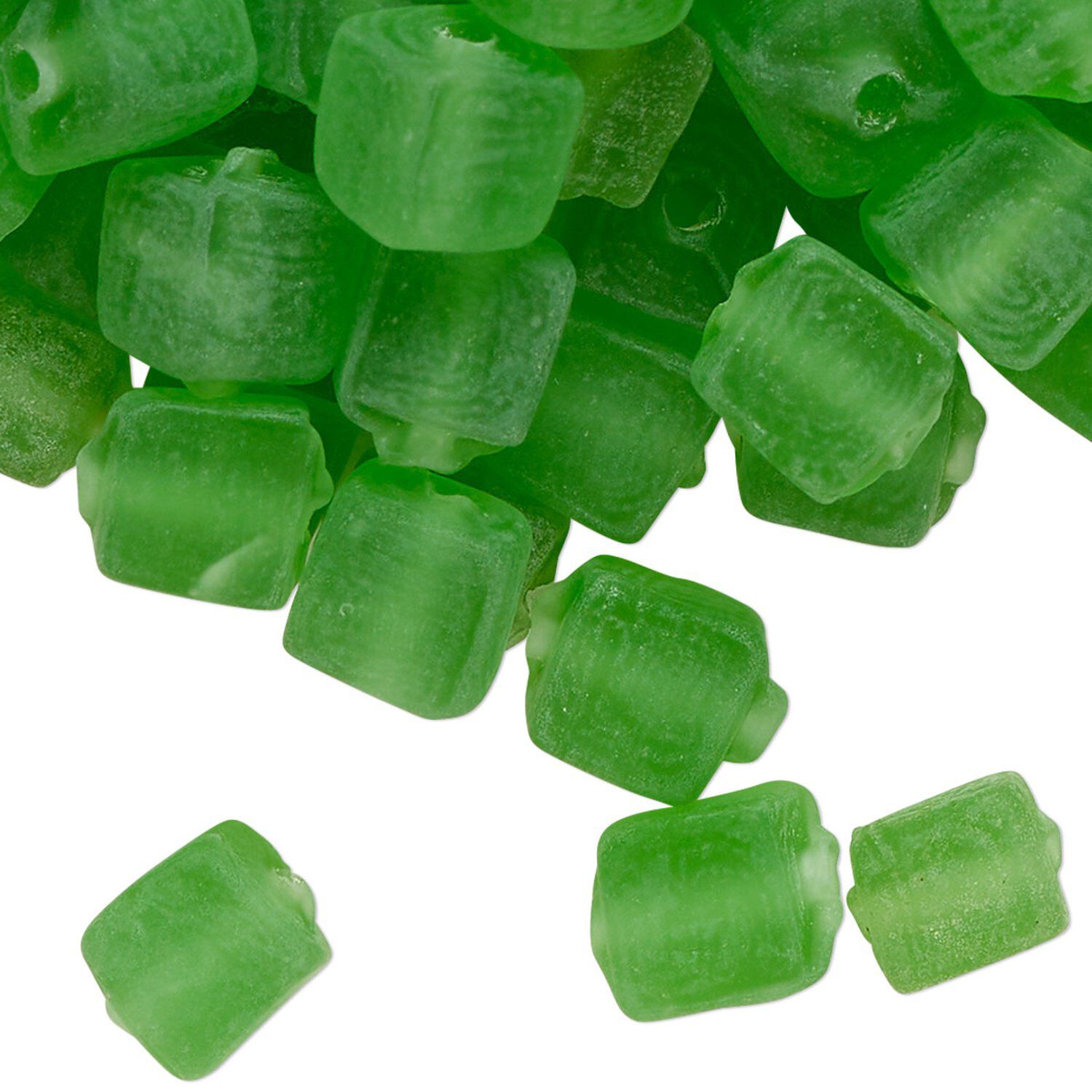 Bead, lampworked glass, translucent frosted green, 9mm cube. Sold per 4-ounce pkg, approximately 95 beads.