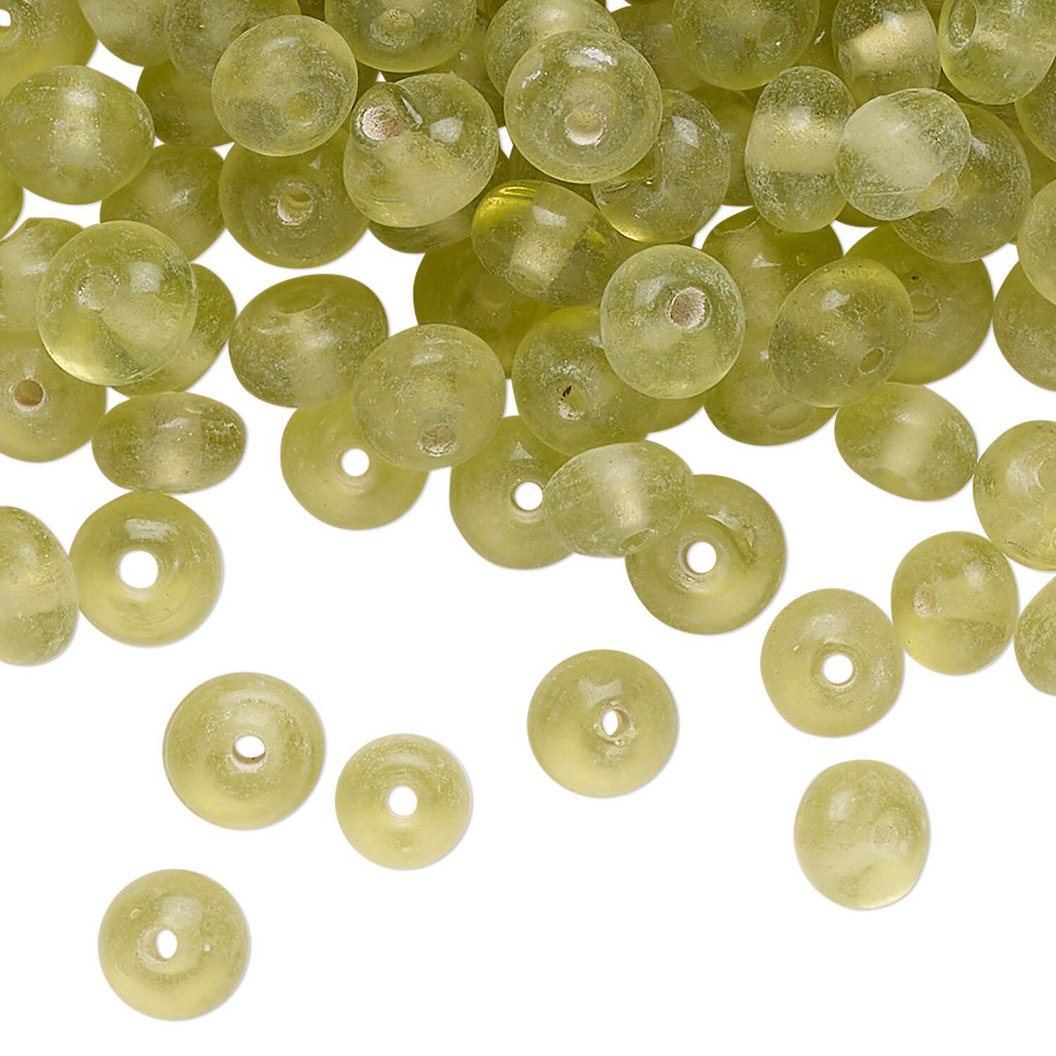 Bead, lampworked glass, translucent yellow-green, 6x4mm-7x5mm rondelle. Sold per 2-ounce pkg, approximately 265 beads.