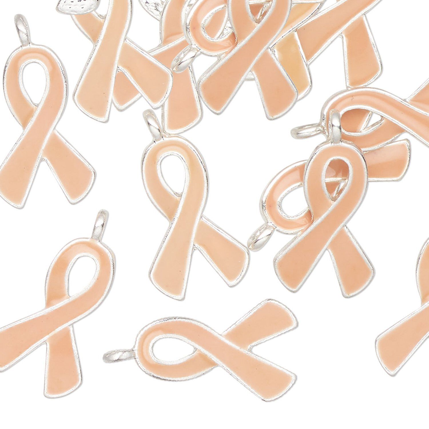 Charm, silver-finished enamel "pewter" (zinc-based alloy), light peach, 17x11mm single-sided awareness ribbon. Sold per pkg of 12.