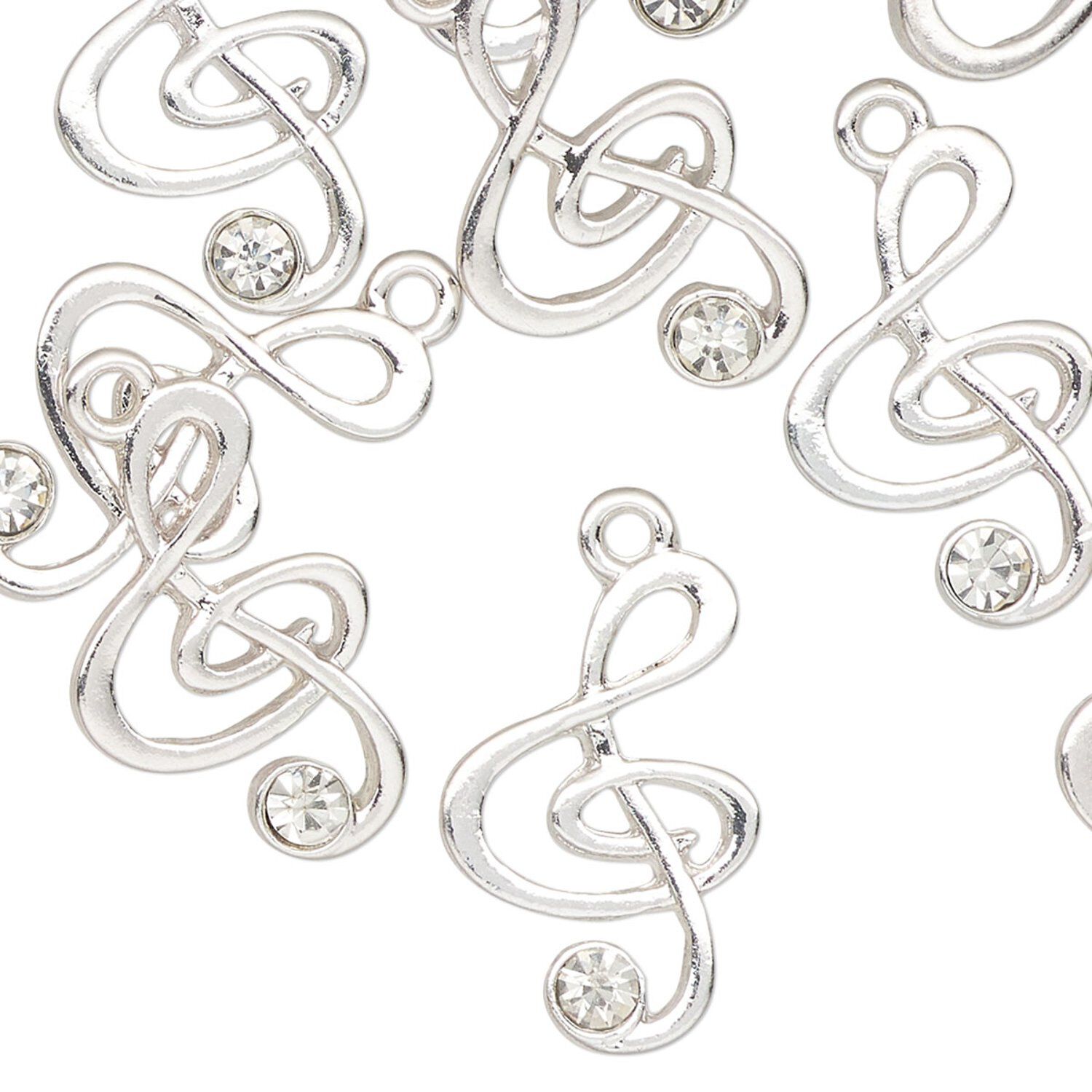 Charm, silver-finished "pewter" (zinc-based alloy) and glass, clear, 20x13mm clef note. Sold per pkg of 12.