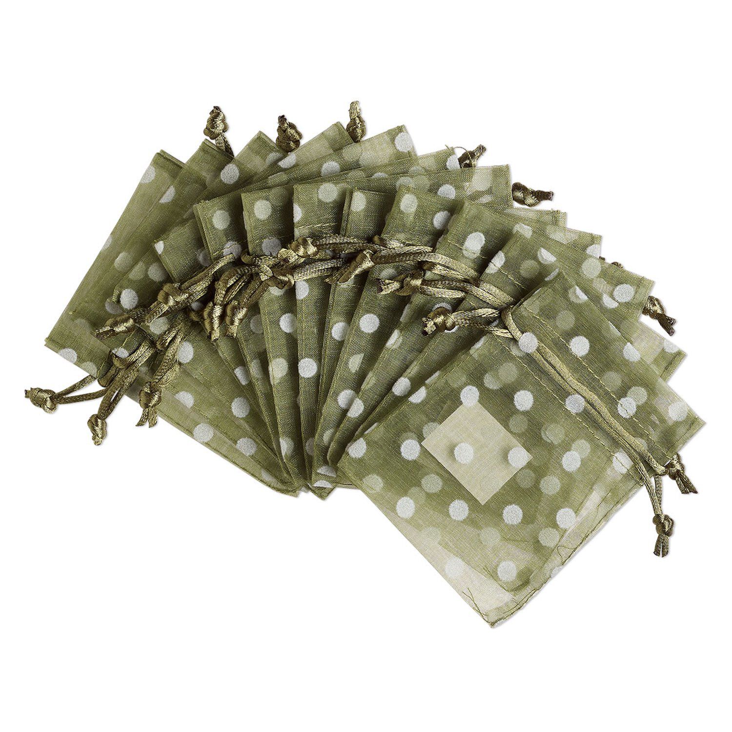 Pouch, flocked organza, moss green and white, 4x3 inches with dots pattern and drawstring closure. Sold per pkg of 12.