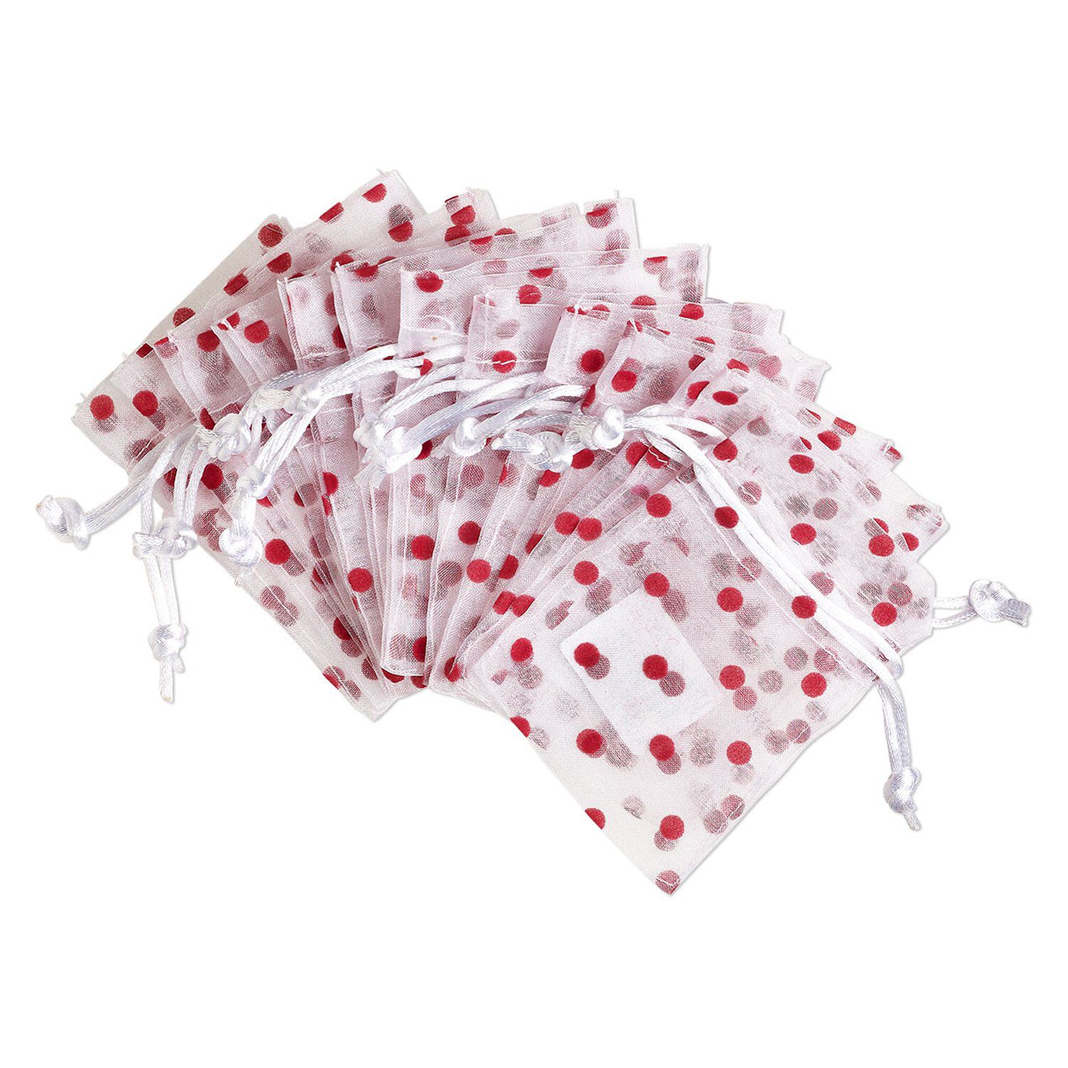 Pouch, flocked organza, white and red, 4x3 inches with dots pattern and drawstring closure. Sold per pkg of 12.
