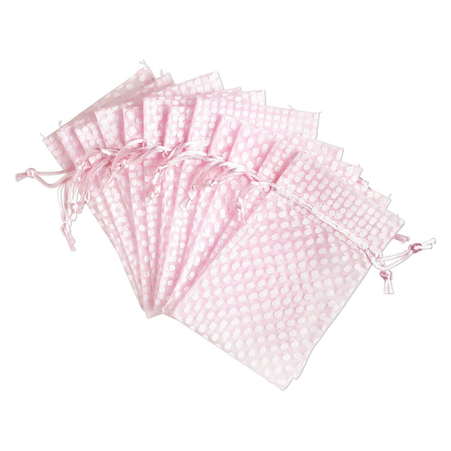 Pouch, organza, light pink and white, 6x4 inches with dots pattern and drawstring closure. Sold per pkg of 12.