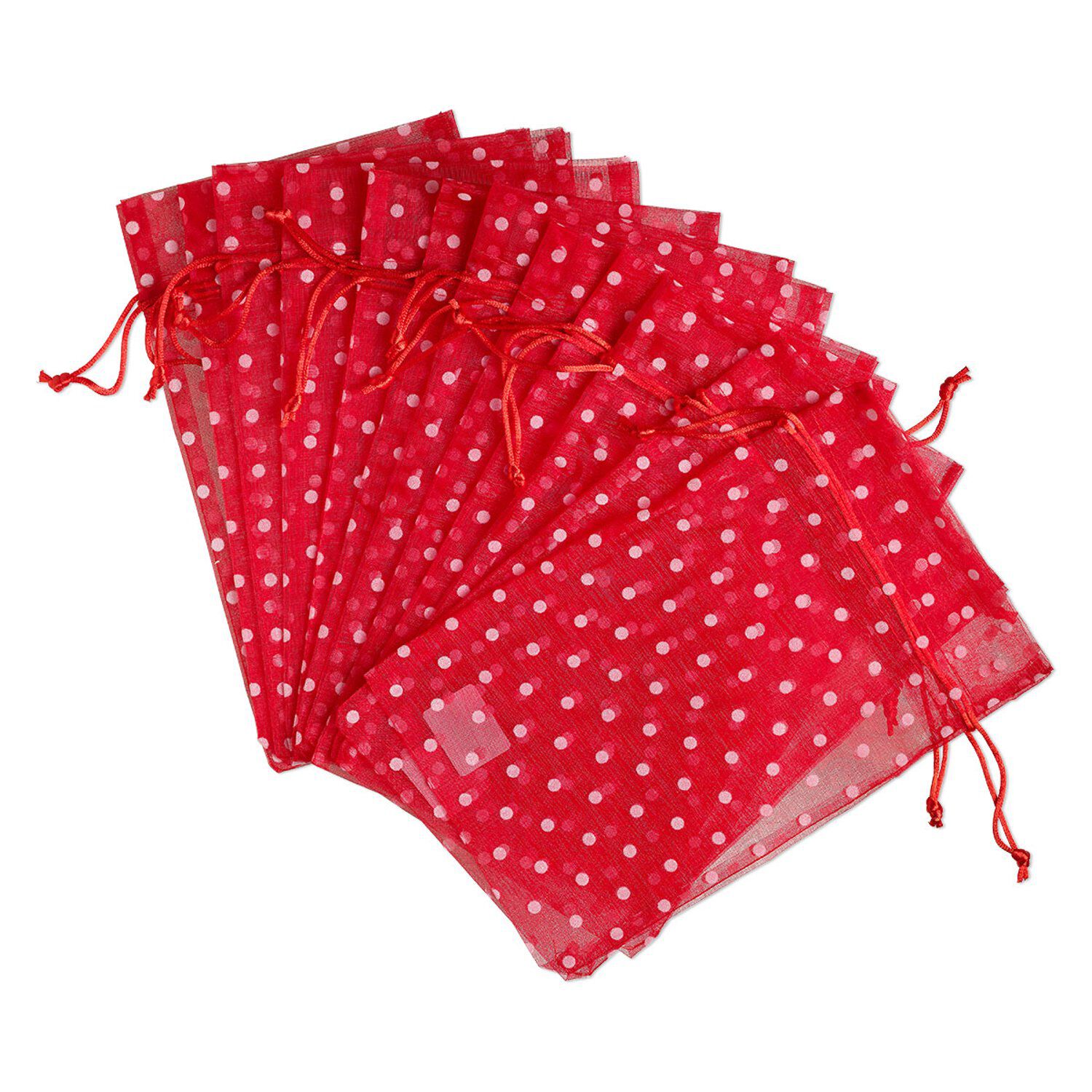 Colorful organza pouches offer a professional presentation to customers purchasing your designs. Lightweight pouches easily travel to shows and add little weight when shipping online orders. Pouches have flocked dots and a red drawstring.