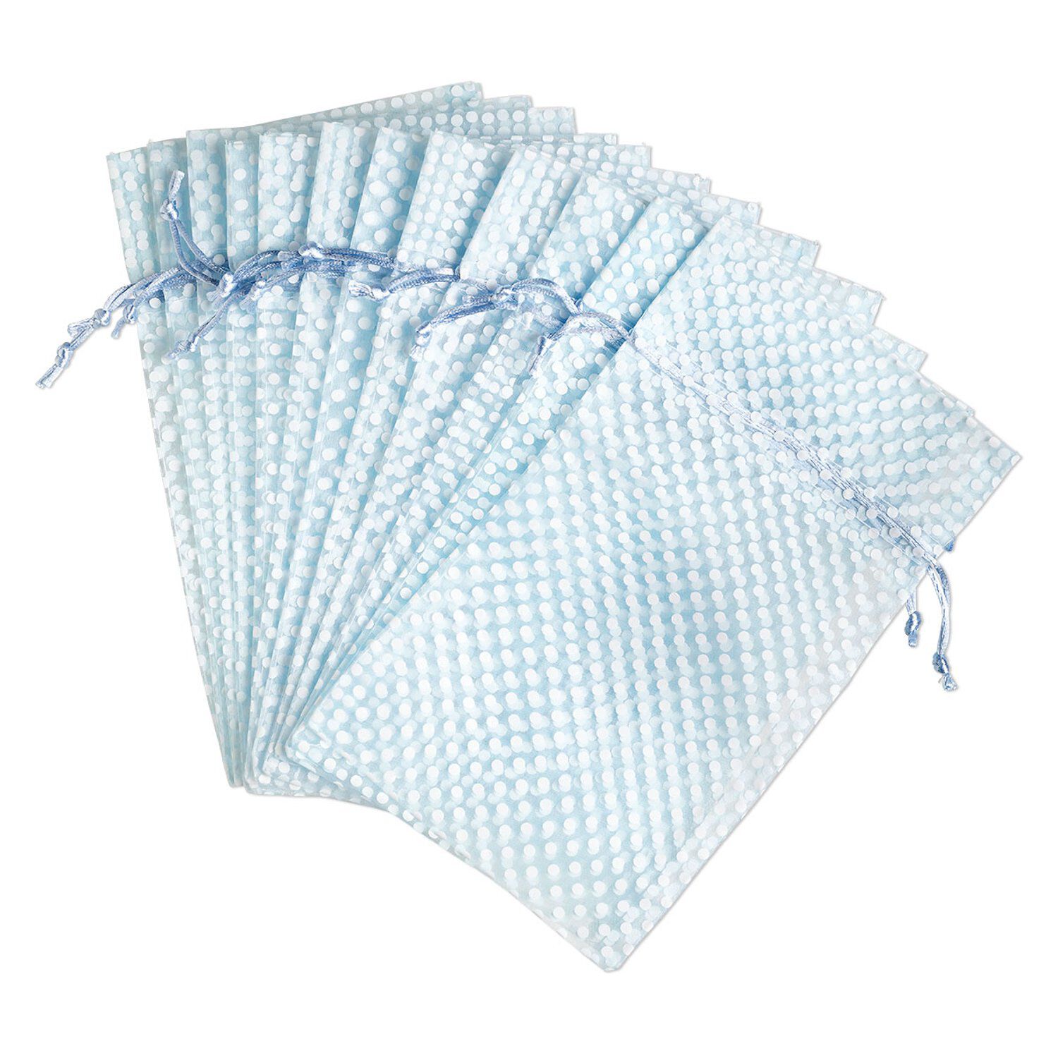 Pouch, organza, light blue and white, 10x6 inches with polkadots pattern and drawstring closure. Sold per pkg of 12.
