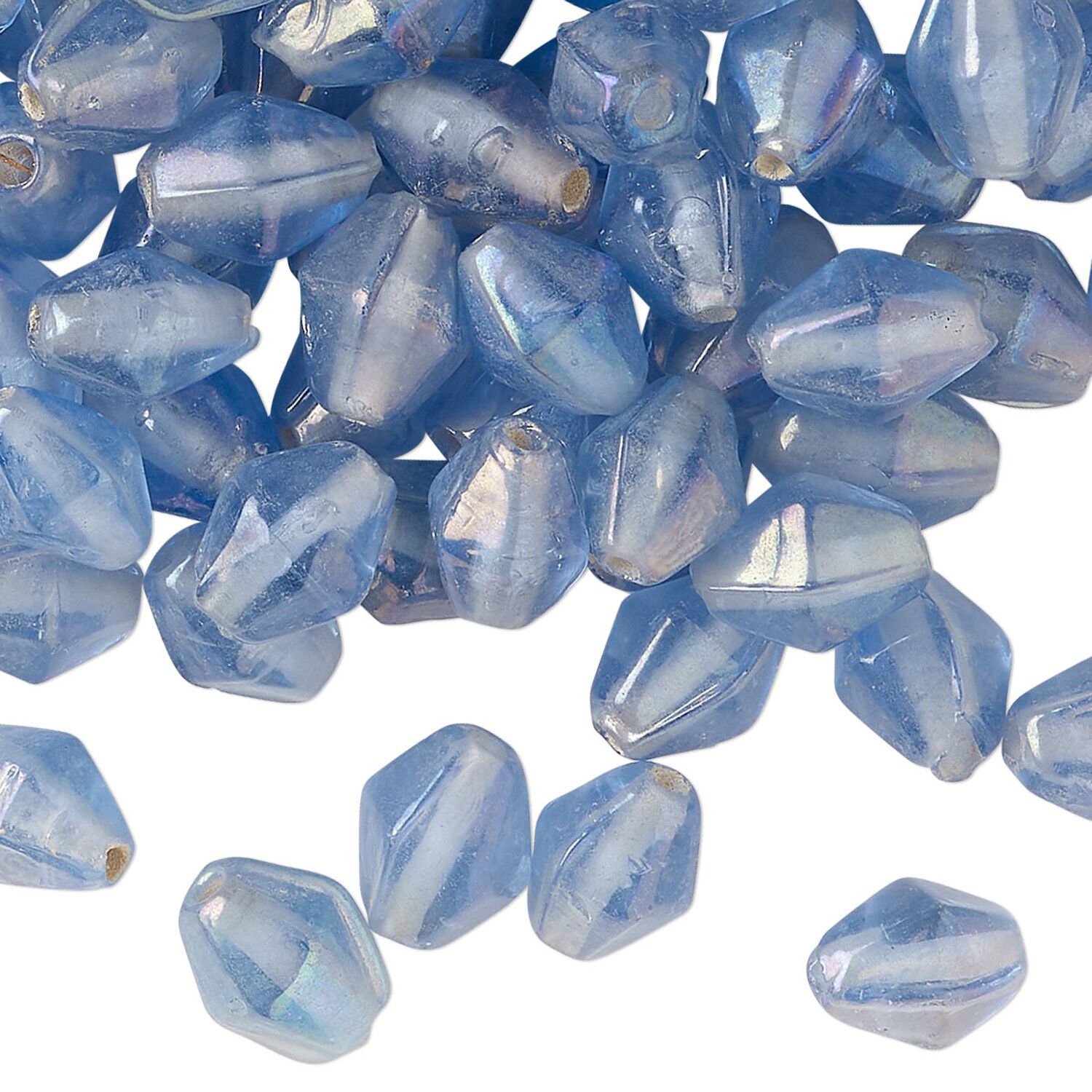 Bead, lampworked glass, translucent light sky blue luster, 9x6mm-10x7mm double cone. Sold per 2-ounce pkg, approximately 130 beads.