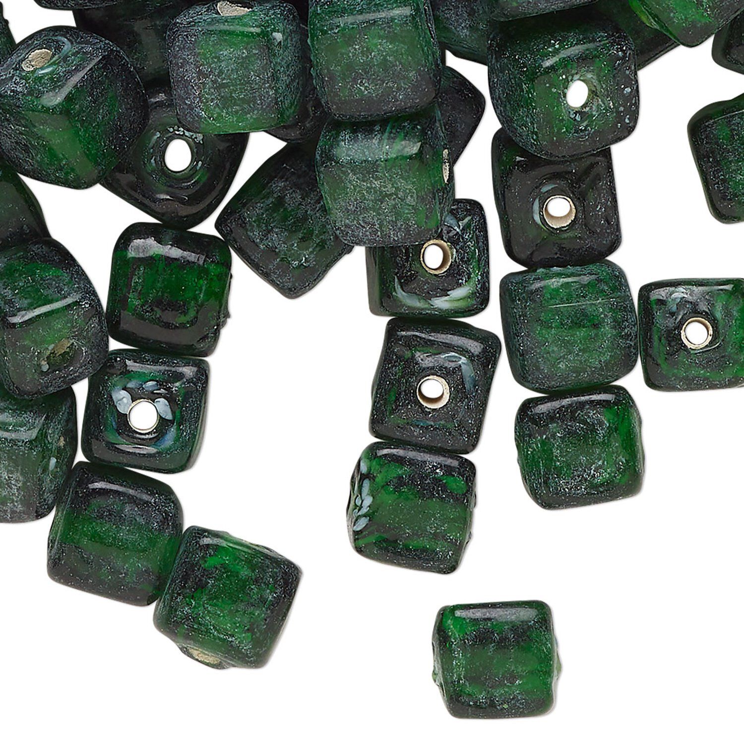 Bead, lampworked glass, translucent dark green, 8mm cube. Sold per 4-ounce pkg, approximately 150 beads.