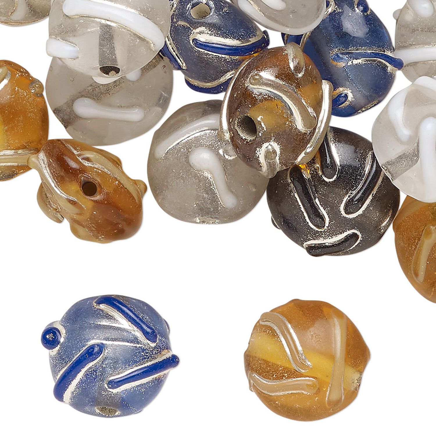 Bead mix, lampworked glass, translucent mixed colors, 13mm puffed flat round with swirl design. Sold per 2-ounce pkg, approximately 35 beads.