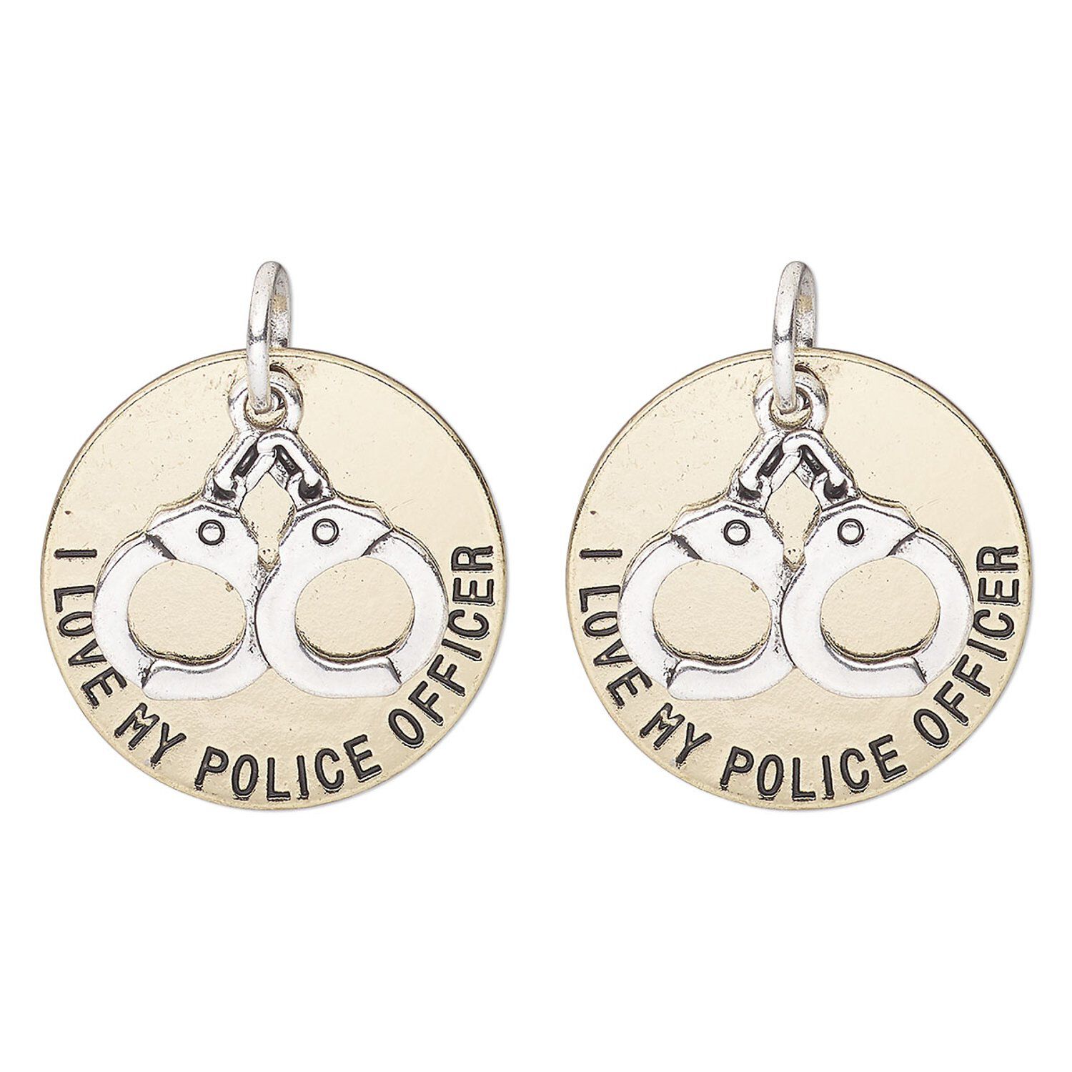 Drop, antique silver- and brass-finished "pewter" (zinc alloy), 26mm round with handcuffs and "I Love My Police Officer." Sold per pkg of 2.