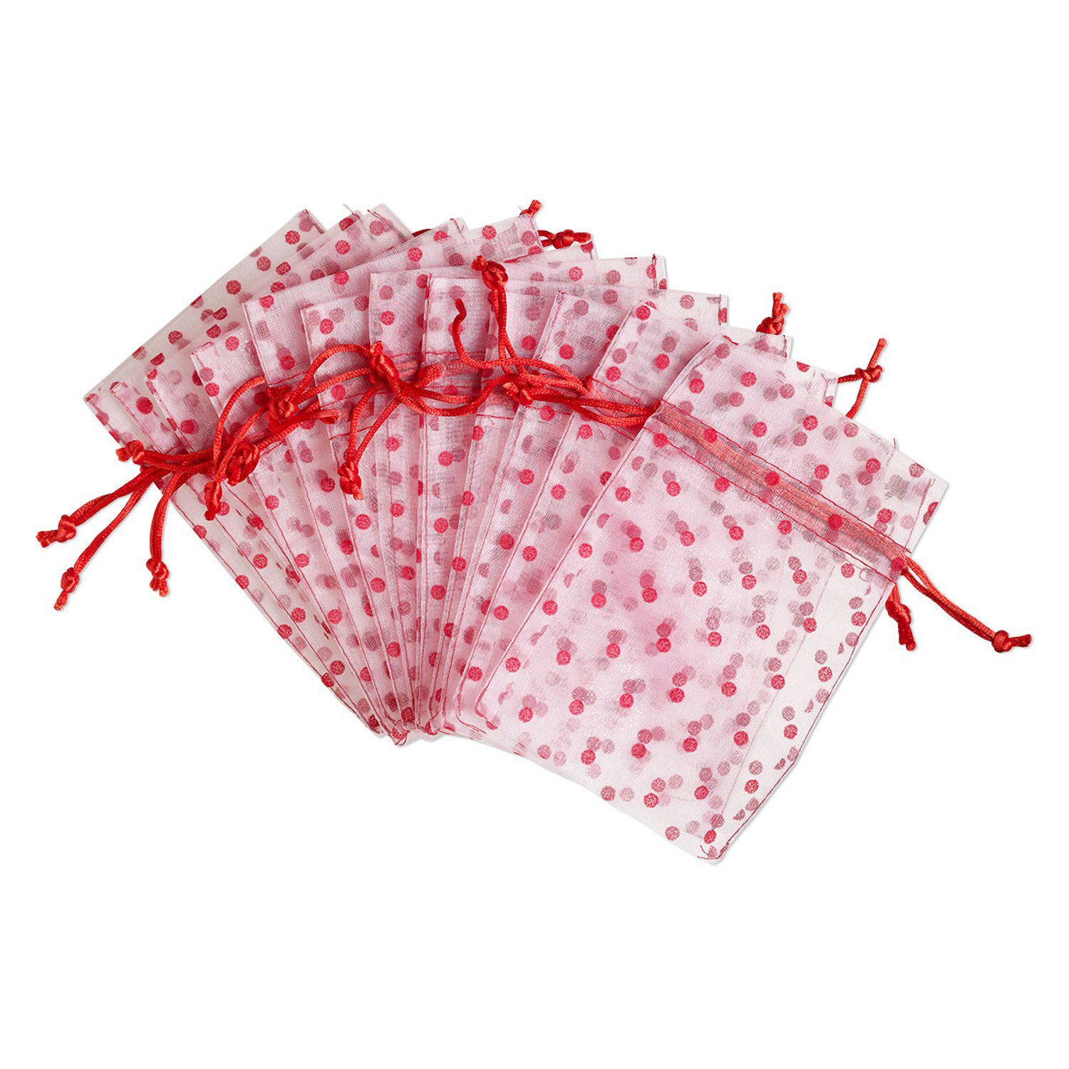 Pouch, organza, white and red, 6x4 inches with dots pattern and drawstring closure. Sold per pkg of 12.