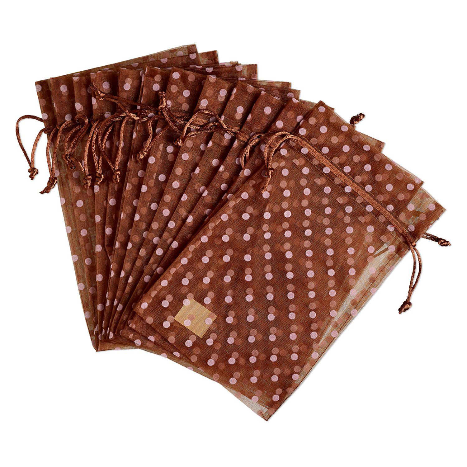 Pouch, organza, brown and pink, 10x6 inches with dots pattern and drawstring closure. Sold per pkg of 12.