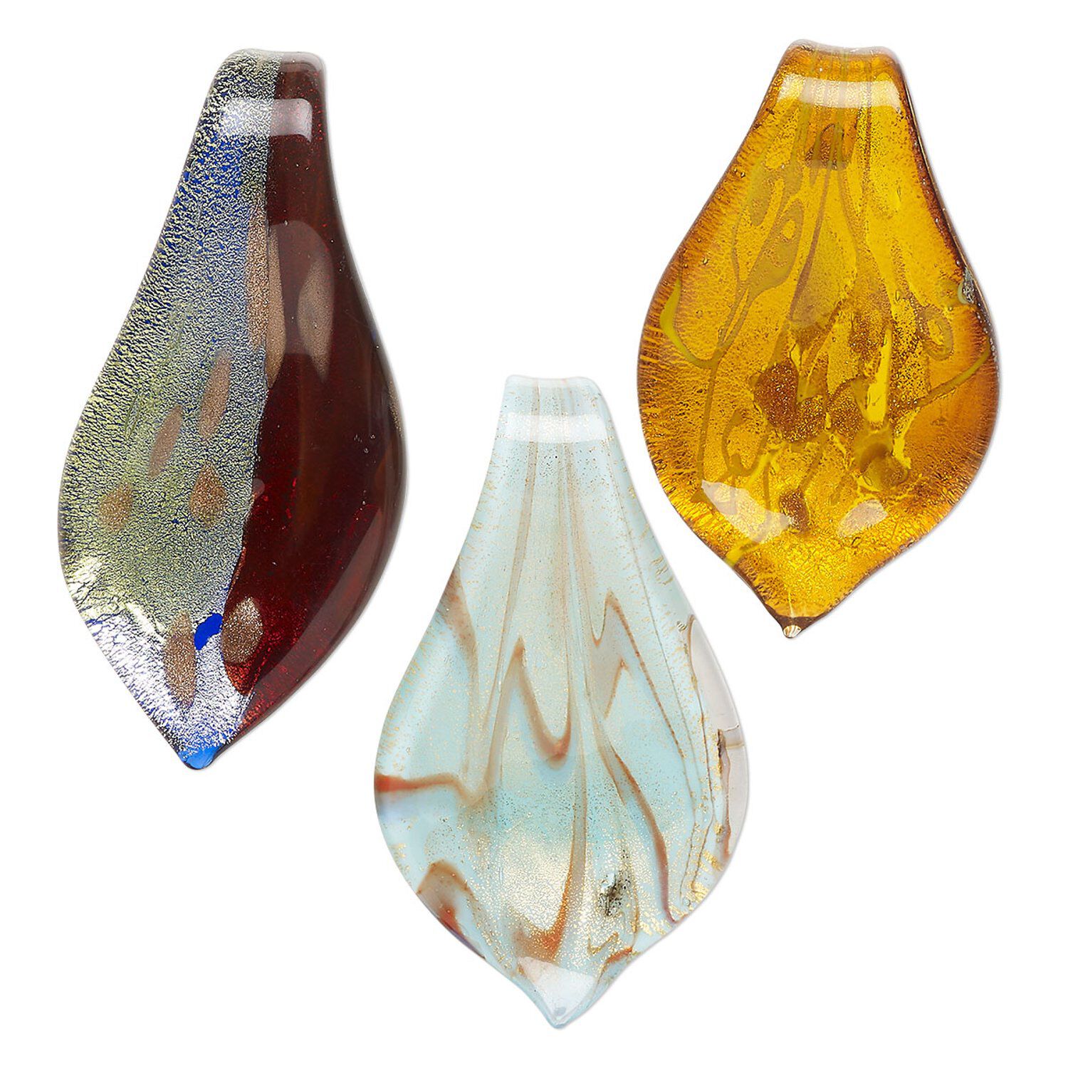 Random mix, lampworked glass, opaque to transparent mixed colors, 40x22mm-52x29mm spoon with silver-colored foil and copper-colored glitter dots and swirls. Sold per pkg of 3.