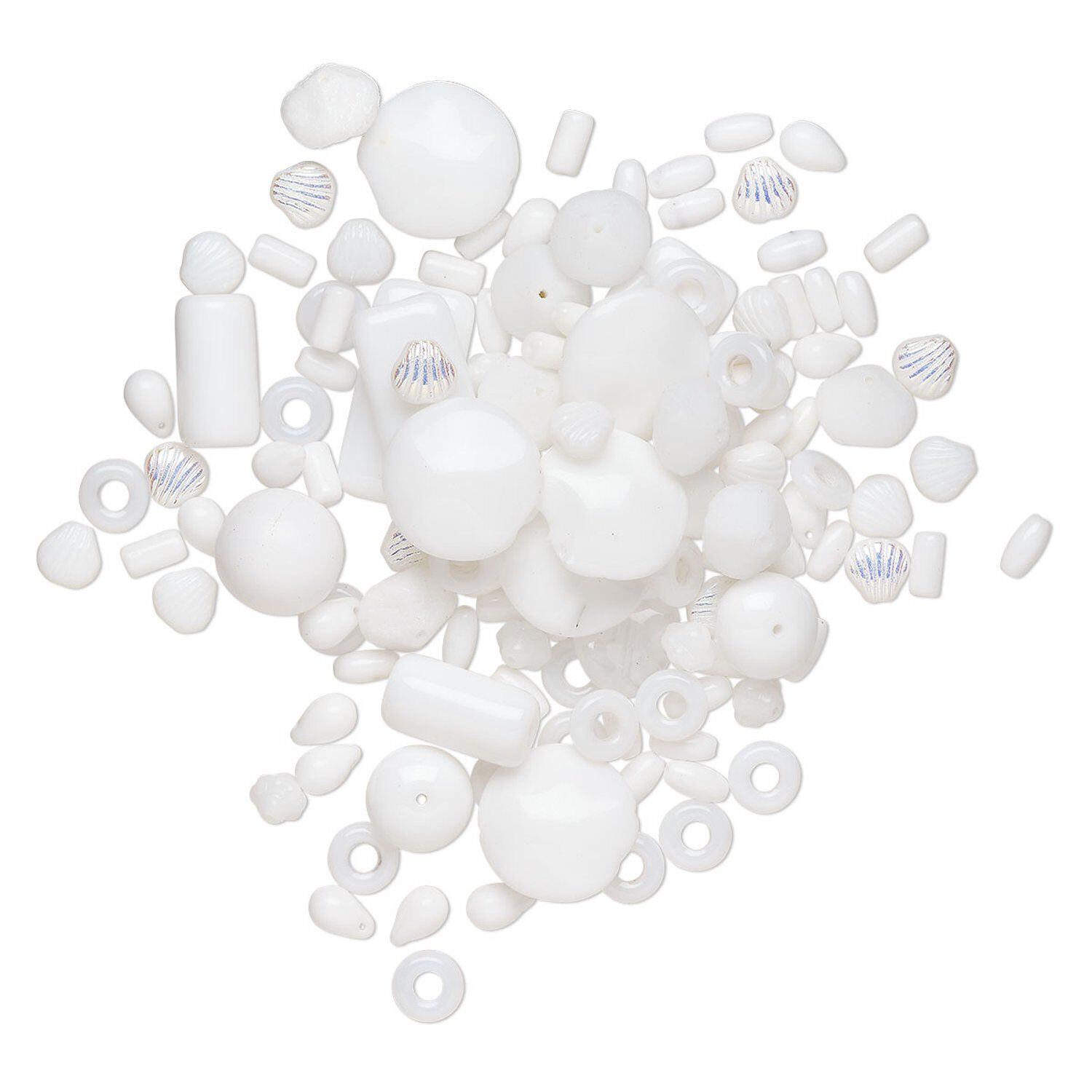Bead mix, Czech pressed glass, iridescent translucent and opaque white, 4-35x8mm mixed shapes. Sold per 4-ounce pkg, approximately 455 beads.