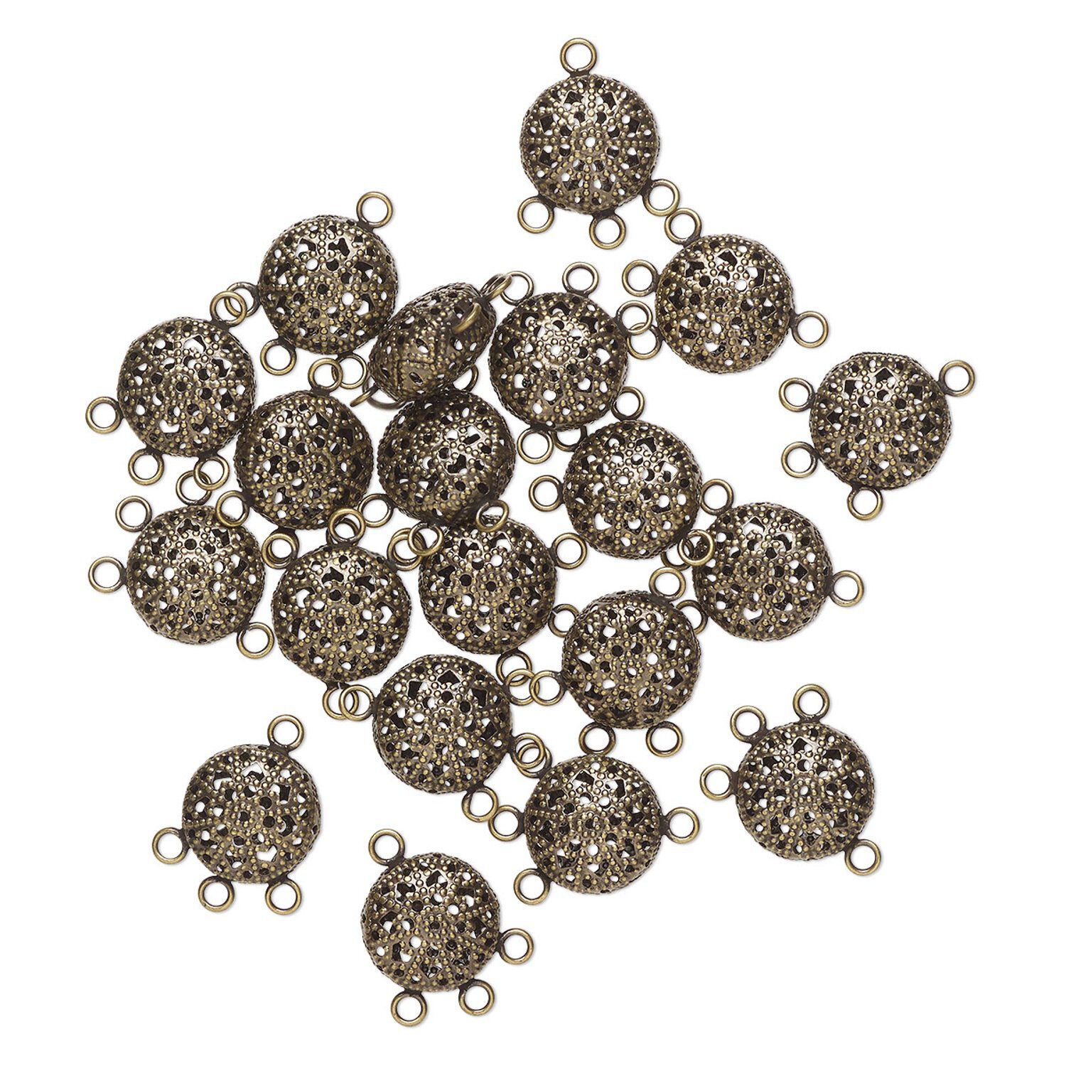 Connector, antique brass-finished brass, 15mm puffed flat round filigree drop with 1 top / 3 bottom loops. Sold per pkg of 20.