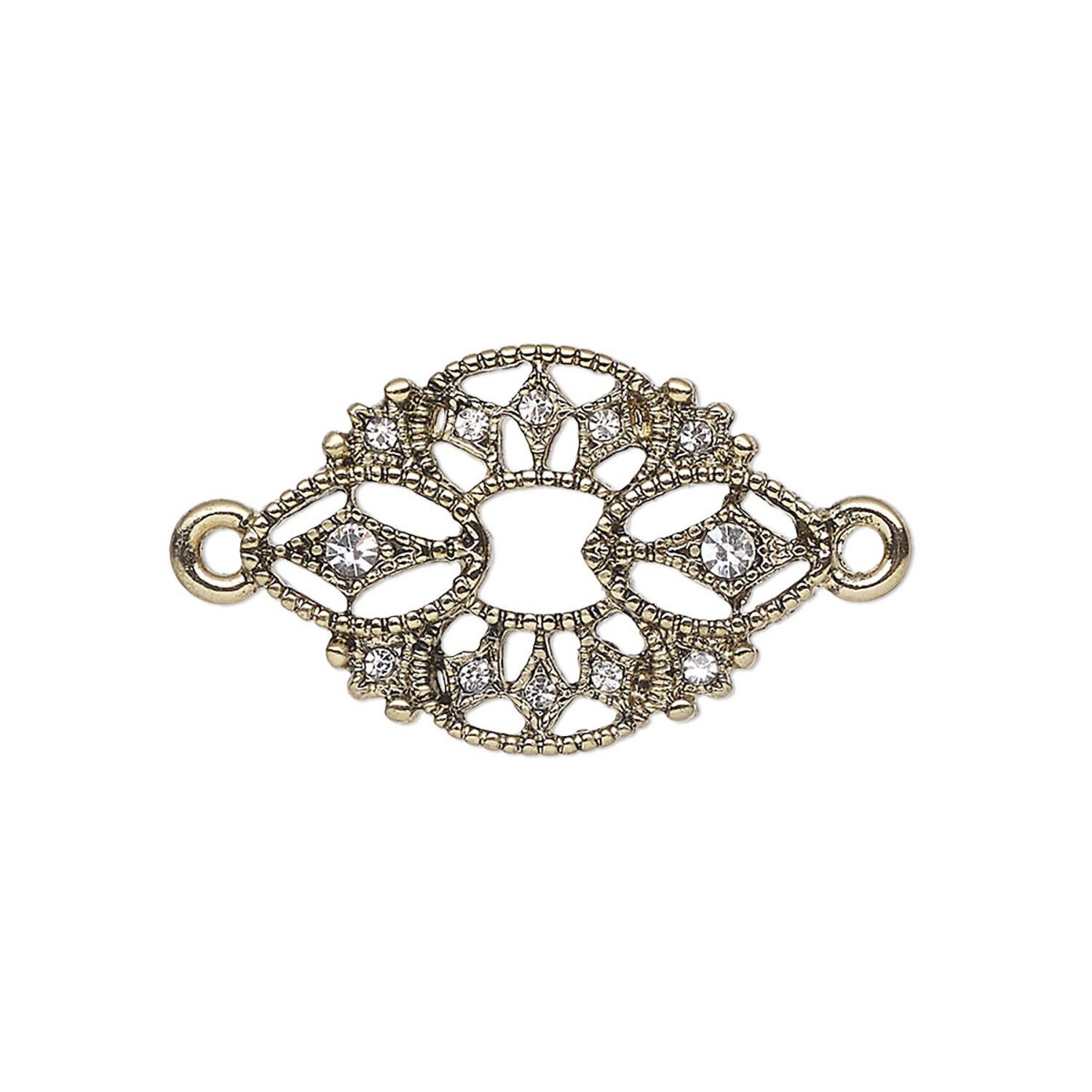 Link, antique brass-finished "pewter" (zinc-based alloy) and glass, clear, 24x17mm fancy oval. Sold individually.