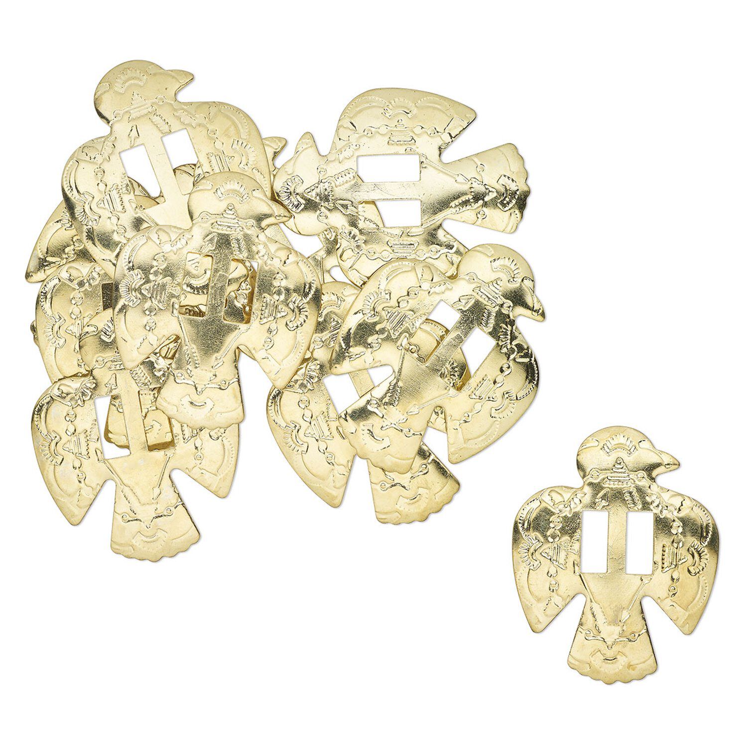 Slide, gold-finished steel, 43x35mm textured thunderbird, (2) 10x4.5mm rectangle holes. Sold per pkg of 10.