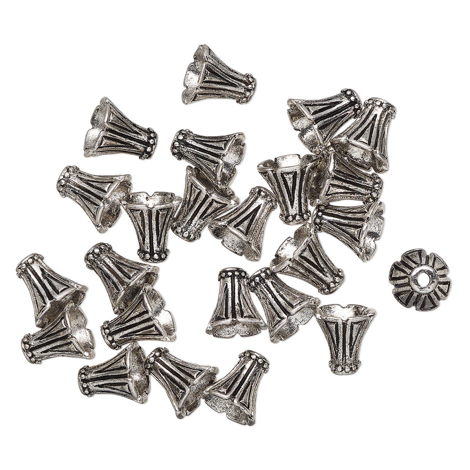 Cone, antique silver-finished "pewter" (zinc-based alloy), 12mm cone with triangle design, 9mm end. Sold per pkg of 24.